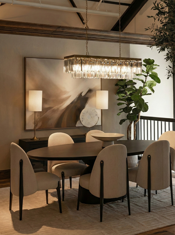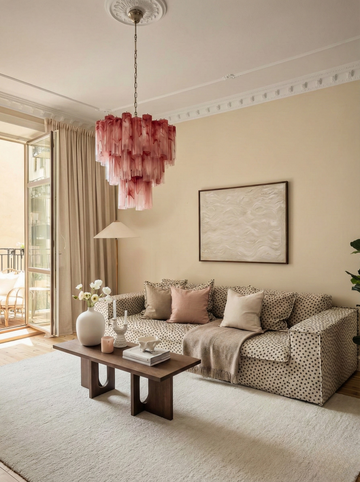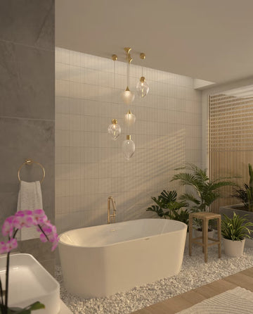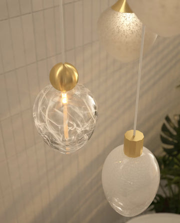 - Material Richness: We combined finishes like Crystal opal ombre with crackle and Sandblasted crystal with golden mica to add texture and a soft, diffused glow that feels organic rather than manufactured.