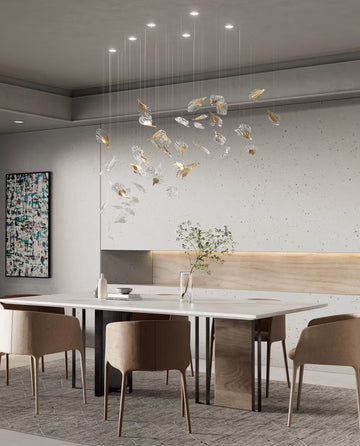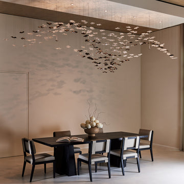 - Organic Inspiration: The handblown crystal components are shaped like leaves drifting in the wind. We arranged them to mimic a gust of wind sweeping through the space.