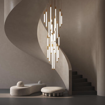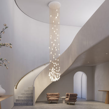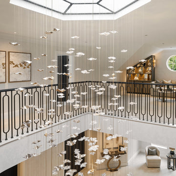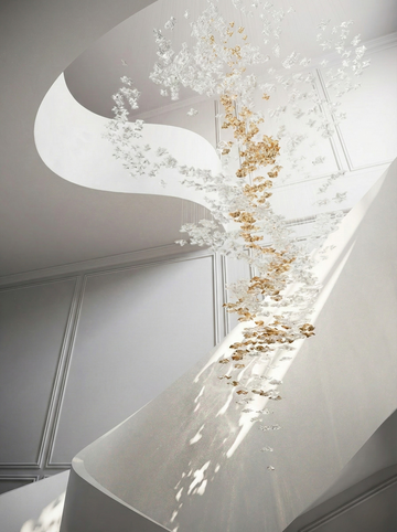 The client needed a statement piece for a grand high-ceiling stair void. The goal was to fill the massive vertical space without blocking the view, requiring a design that felt grandiose yet airy and elegant.