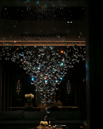 The installation transformed the void into a sculptural masterpiece. When lit, the light refracts through the crystals, creating a stunning interplay of shadows and "motion." It’s no longer just a light; it’s a swarm of butterflies dancing in the home.