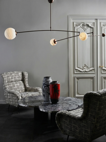- Fluid Motion: The suspension cables were adjusted to different lengths, creating a wave-like formation that leads the eye across the room, enhancing the feeling of flow.