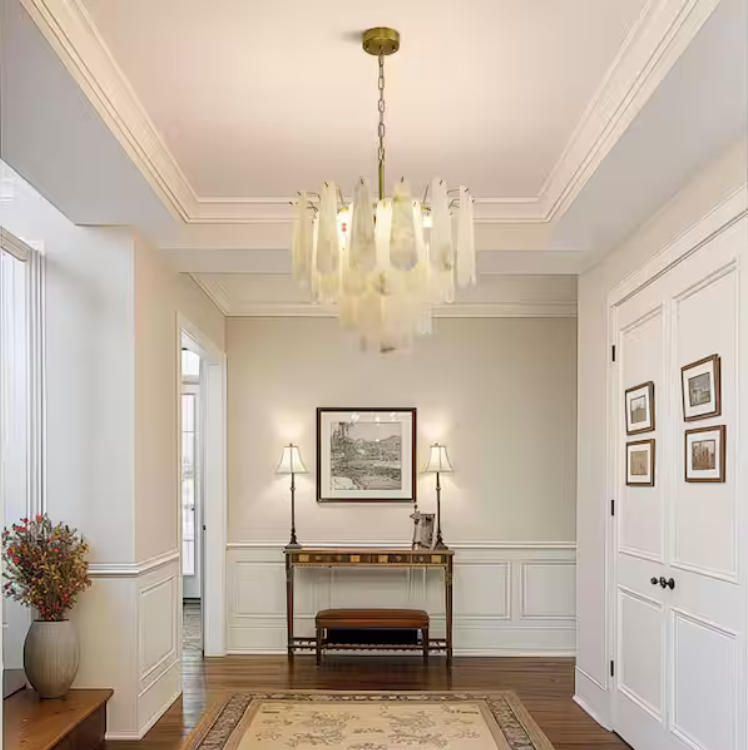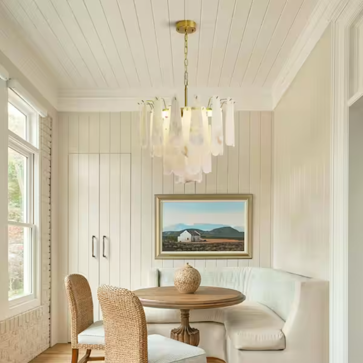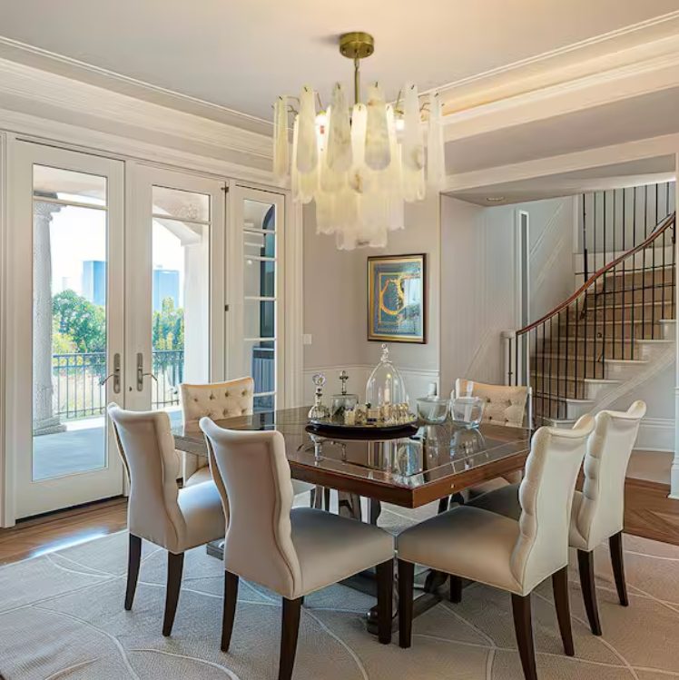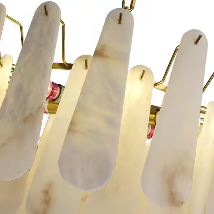 The dining room chandelier is made of genuine natural stone, with a total of 43 marble pieces. Each piece of stone is carefully selected and hand-polished for a smooth, silky finish and a delicate, luxurious texture like clouds. The alabaster pendant light showcases the beauty of nature with a minimalist feel, enhancing the natural beauty of the stone while showcasing a sophisticated and glamorous look.