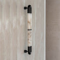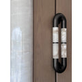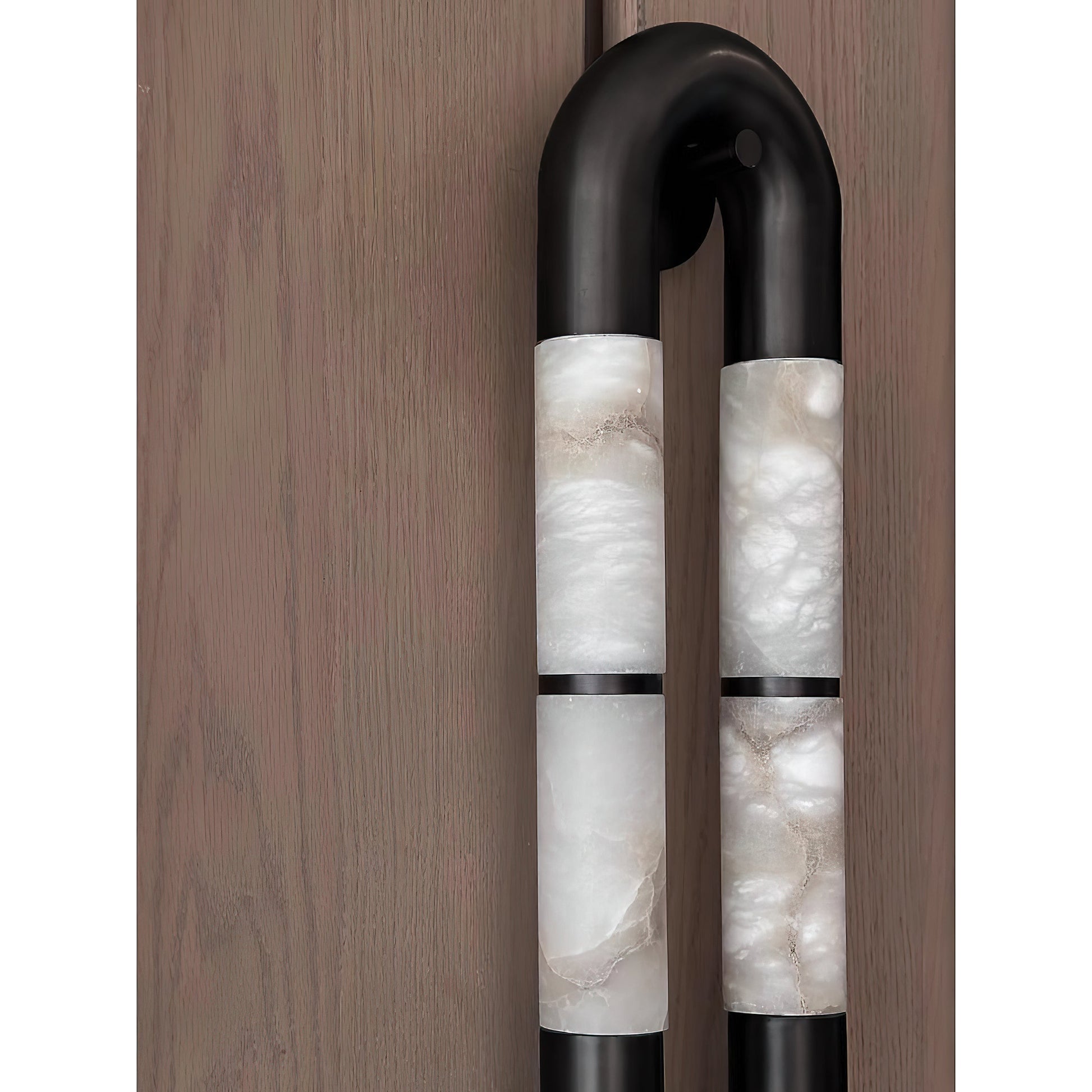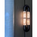 Elevate your space with the Alabaster Banded KoKo Sconce, expertly framed in sleek black stainless steel. Its natural alabaster veining gently diffuses light, casting a warm, ambient glow that enhances bathrooms, hallways, and modern interiors.