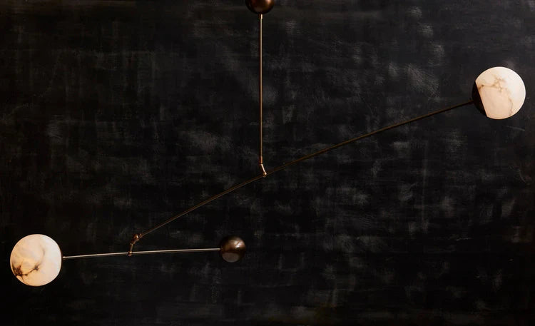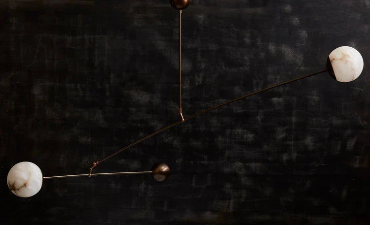Introduce a captivating focal point to any room with our Alabaster Mobile Chandelier. This unique kinetic sculpture combines timeless materials with graceful movement. Featuring two softly glowing alabaster globes suspended from a structure of richly patinated brass, the chandelier is balanced by a sleek, round counterweight. A gentle breeze or a subtle touch sets the entire piece into a slow, mesmerizing dance, casting beautiful, dynamic shadows. More than a light source, it's a statement piece of living art.