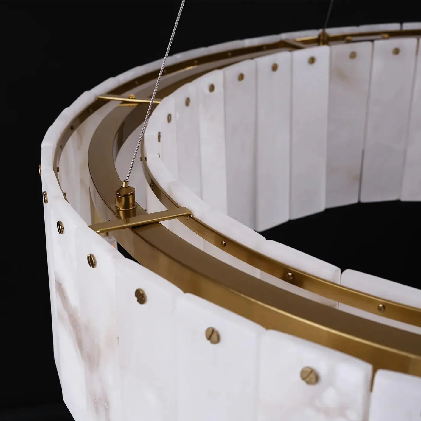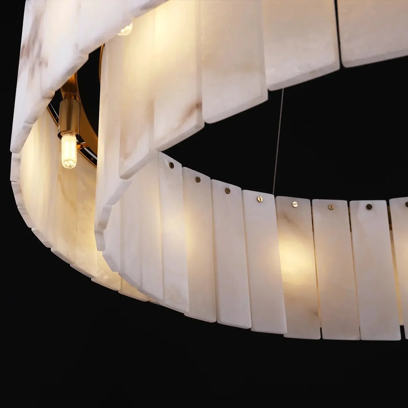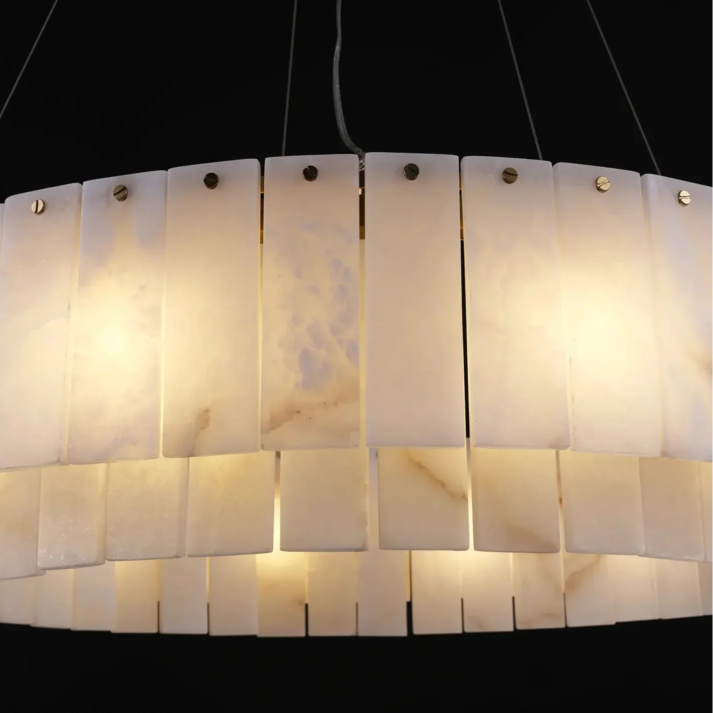 This alabaster chandelier is crafted from natural marble imported from Spain, where intricate patterns evolve over time, resulting in a distinctive and beautiful design. Each marble chandelier boasts a unique pattern, carefully selected and polished for durability. With strong light transmission and a non-glare effect, it emanates a gentle, bright light, creating an ambiance of subtle radiance.