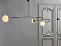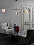 The Alabaster Triple Mobile Chandelier handcrafted with precision, three gracefully curved arms, finished in a warm, rich patina, extend like branches to present a collection of luminous, solid alabaster globes.