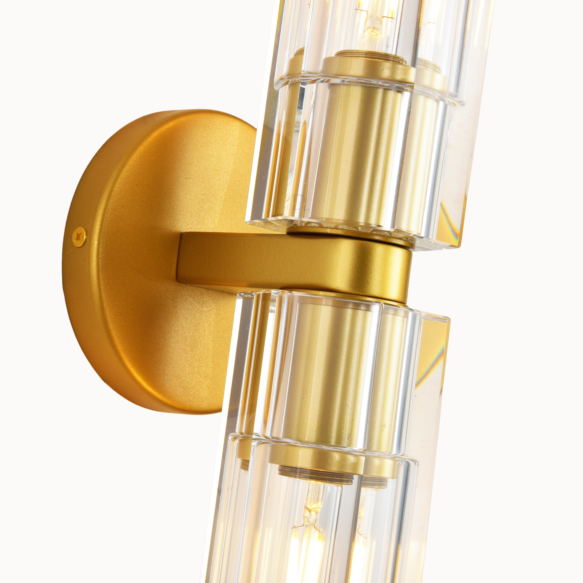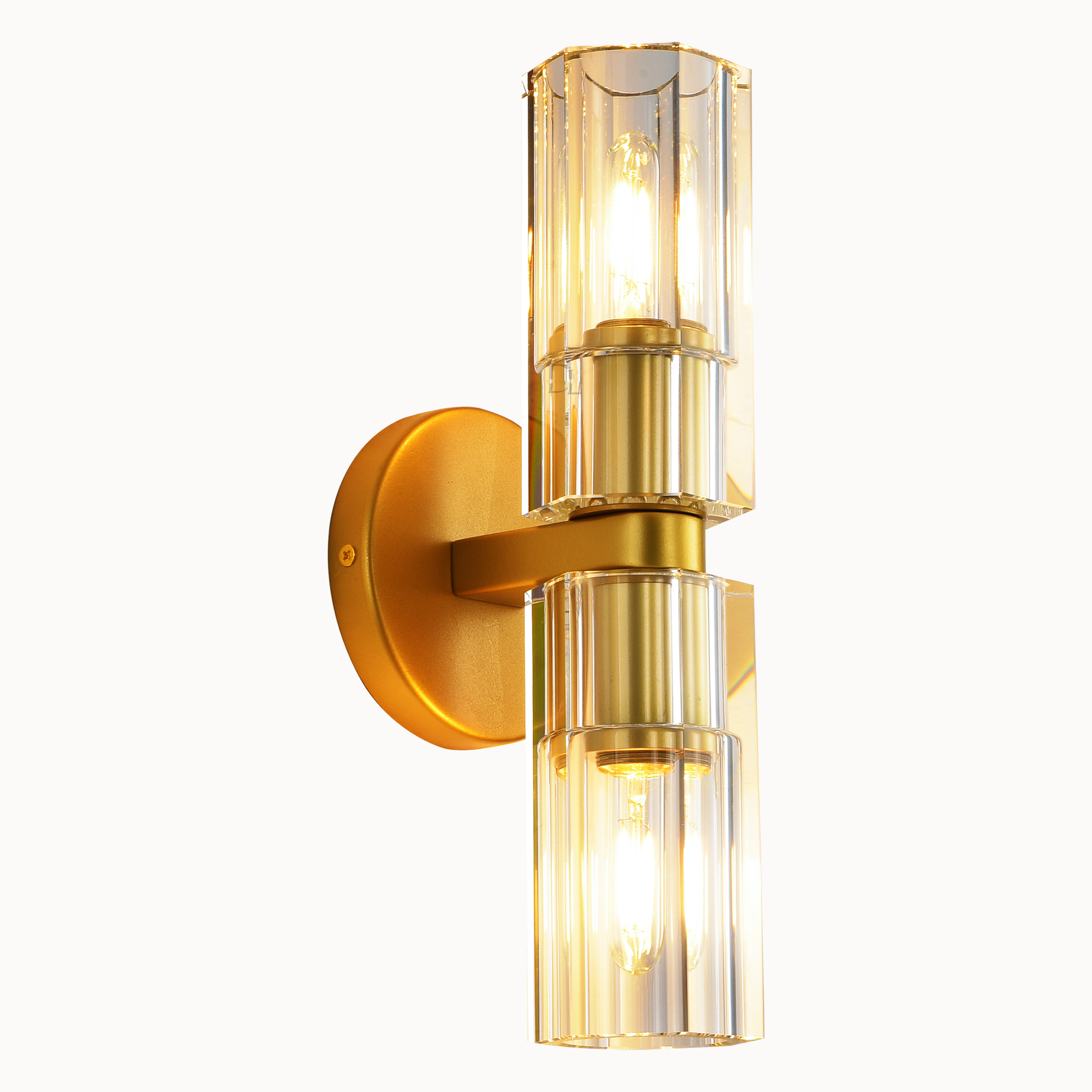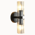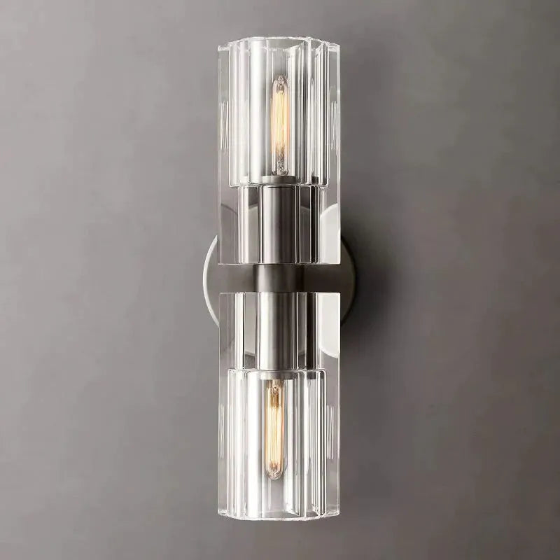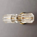 This wall sconce is made of crystal glass with a circular interior juxtaposition that runs along a simple, sturdy metal frame. The frame is made of solid brass and is available in a painted burnished brass or bronze finish, or a polished nickel finish in stainless steel. The lampshade is optically and prismatically made of K9 crystal.