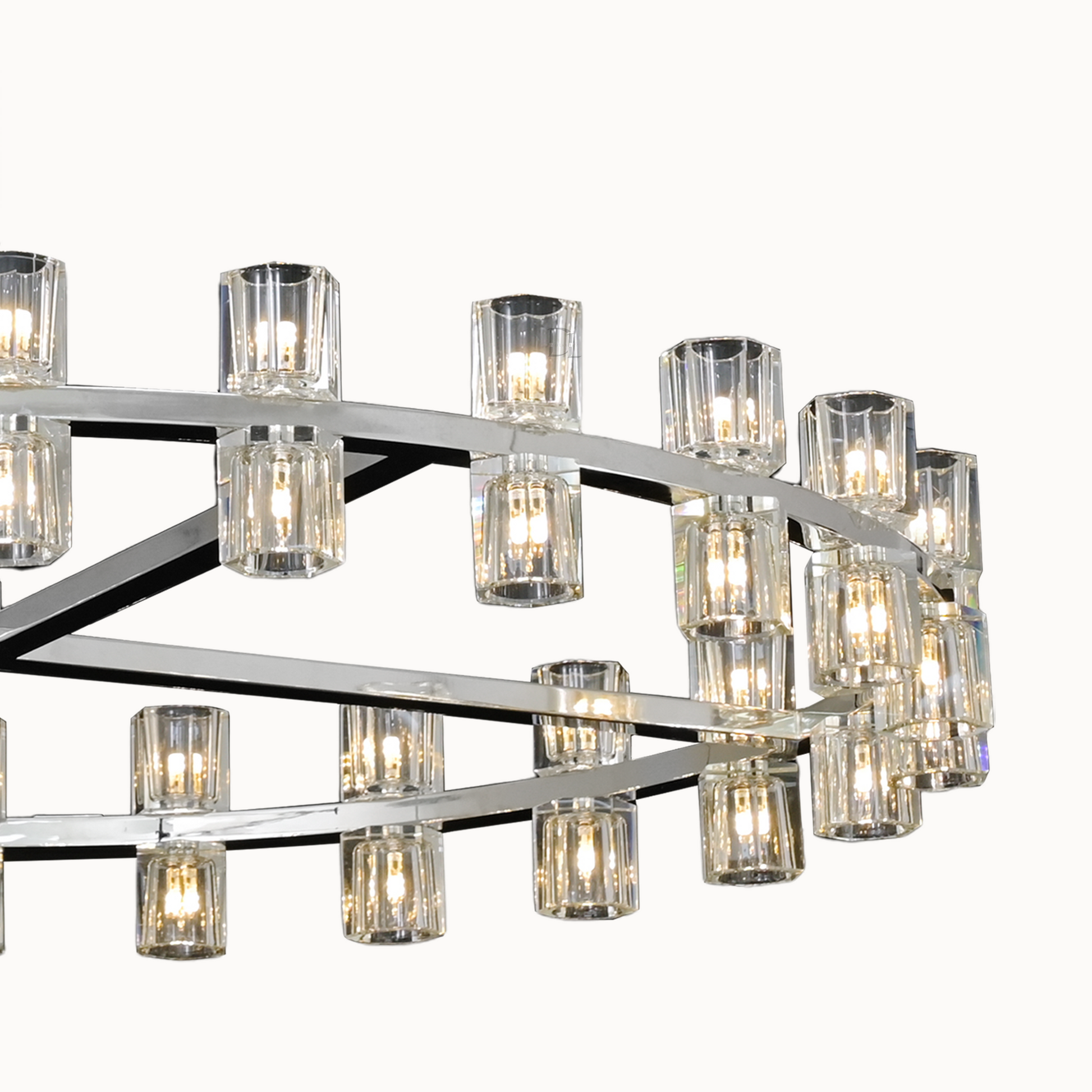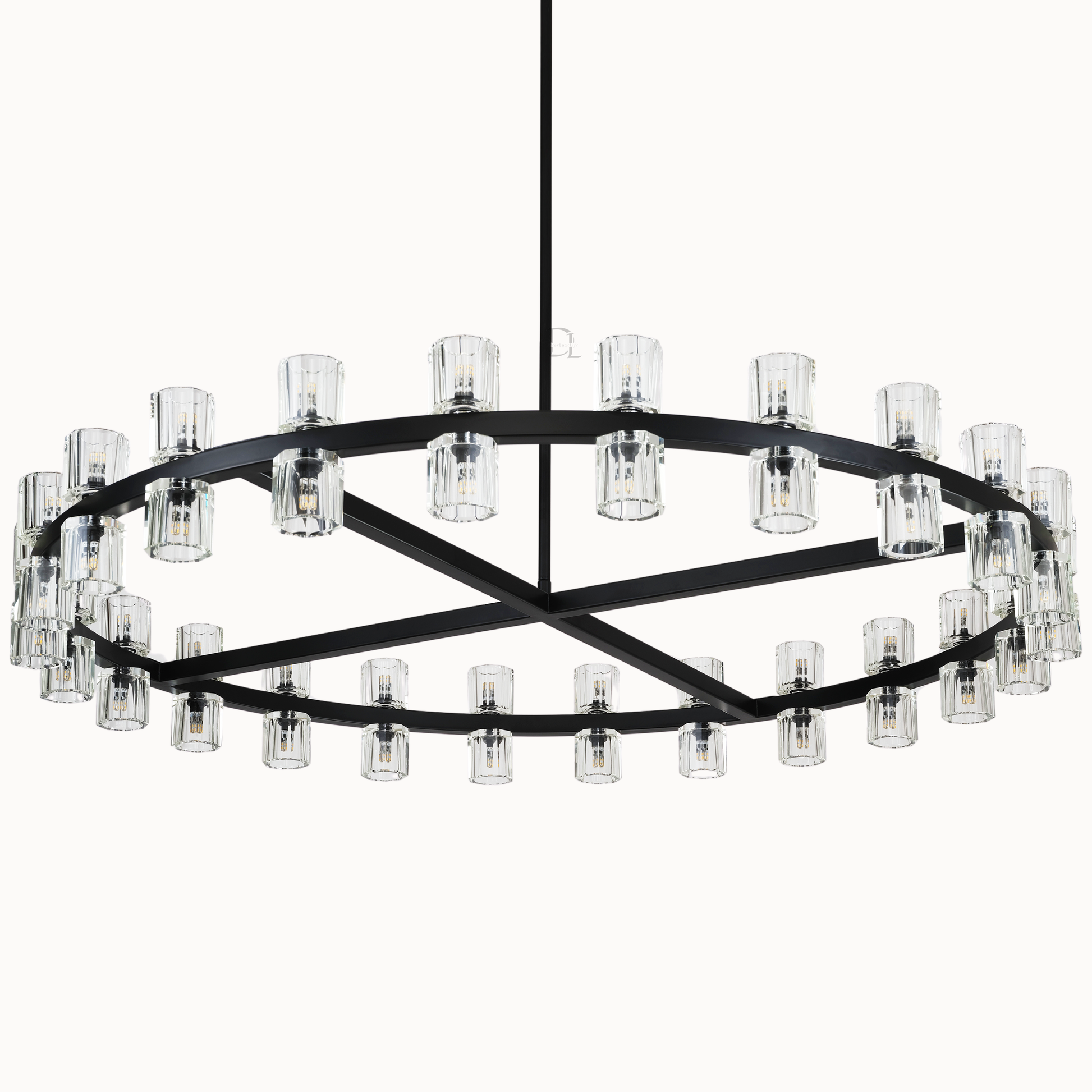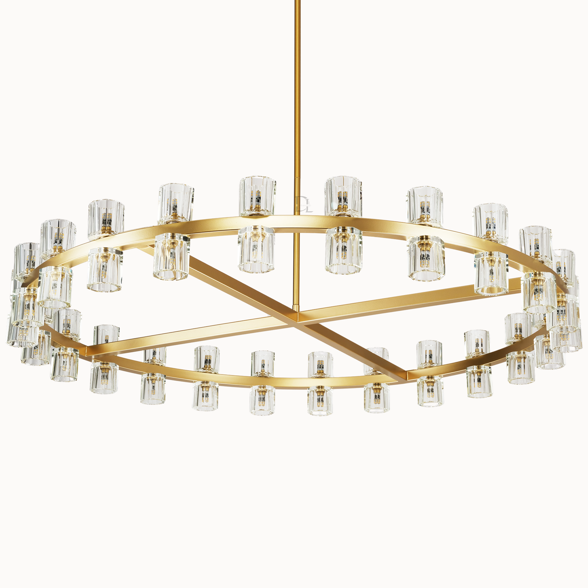 The rhythmic design for this chandelier collection is inspired by the shape and scale of industrial gears, where spokes are interlaced with negative spaces to interlock with other gears. Here, the spokes are hexagonal, juxtaposed with a circular interior made of crystal glass that runs along a simple, sturdy metal frame. The frame is made of solid brass and is available in a lacquered burnished brass or bronze finish, or a polished nickel finish in stainless steel. The lampshade is optically and prismatically made of K9 crystal.