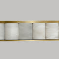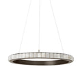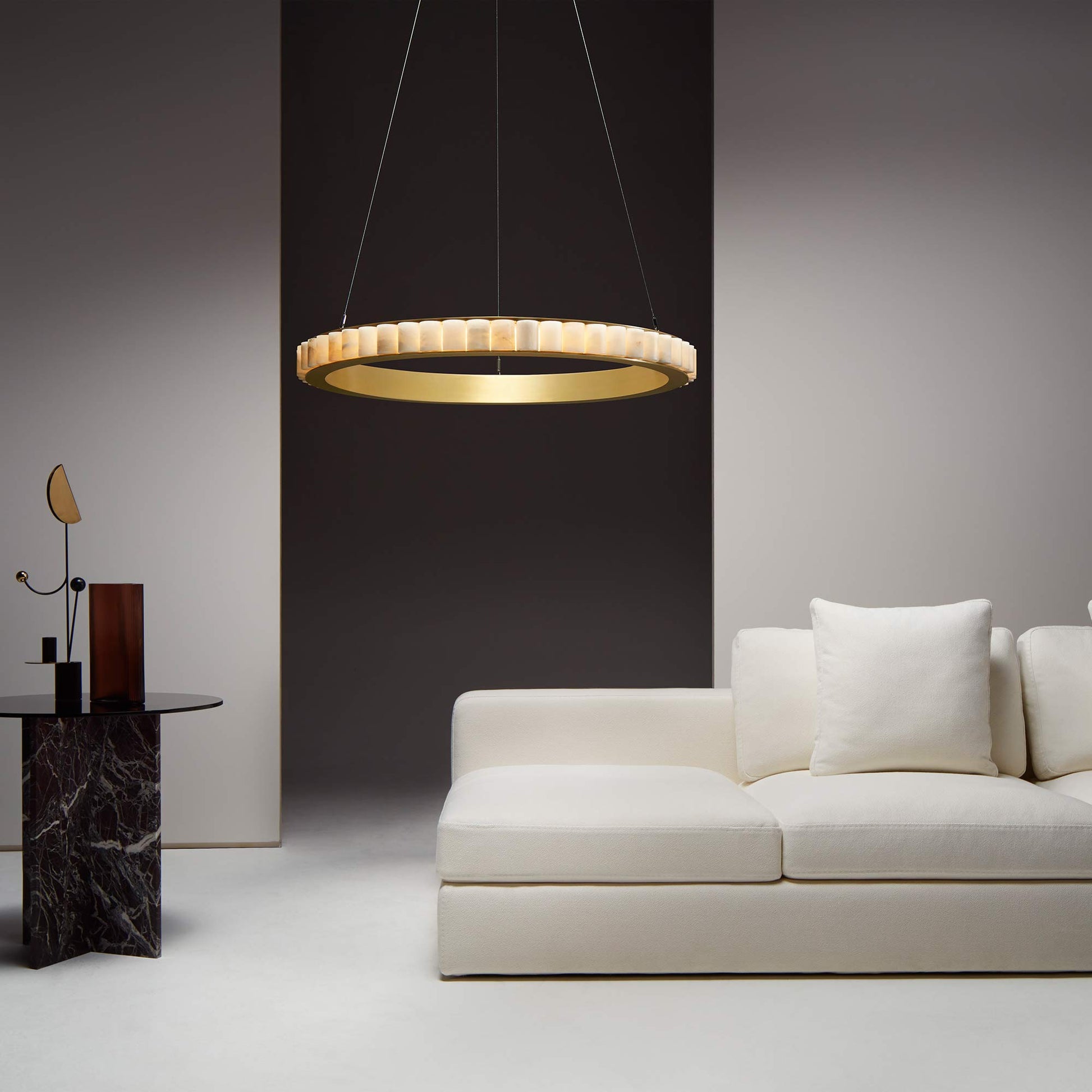 A glam feel follows decadent alabaster lining a metal ring, creating a source of soft, glowing light that changes the mood in a modern space. The Avalon LED Chandelier from CTO Lighting mixes gleaming metal with alabaster to create a simplified silhouette with plenty of decadence. This fixture emits energy-efficient lighting.
