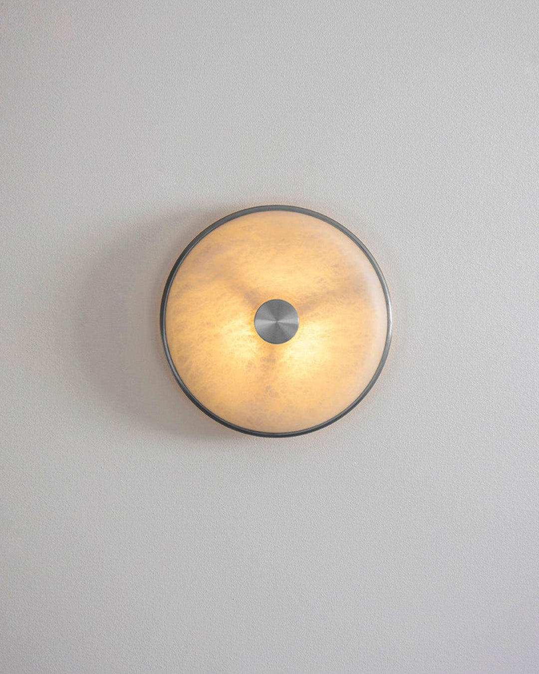 Made from natural alabaster, the Beran wall light by Bert Frank features precision-machined brushed brass or satin nickel with natural alabaster diffusers back and front in an 'oyster shell' design. Each piece relies on the next for support. Available in two sizes, small and large, this elegant wall light is designed to be used in multiples, overlapping and intertwining to create beautiful sculptural silhouettes. The Beran wall light has a IP65 rating and is suitable for wet areas.