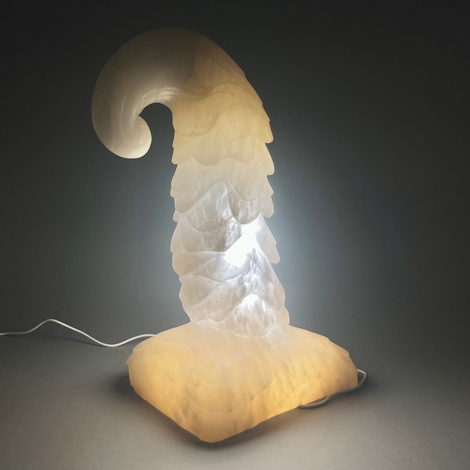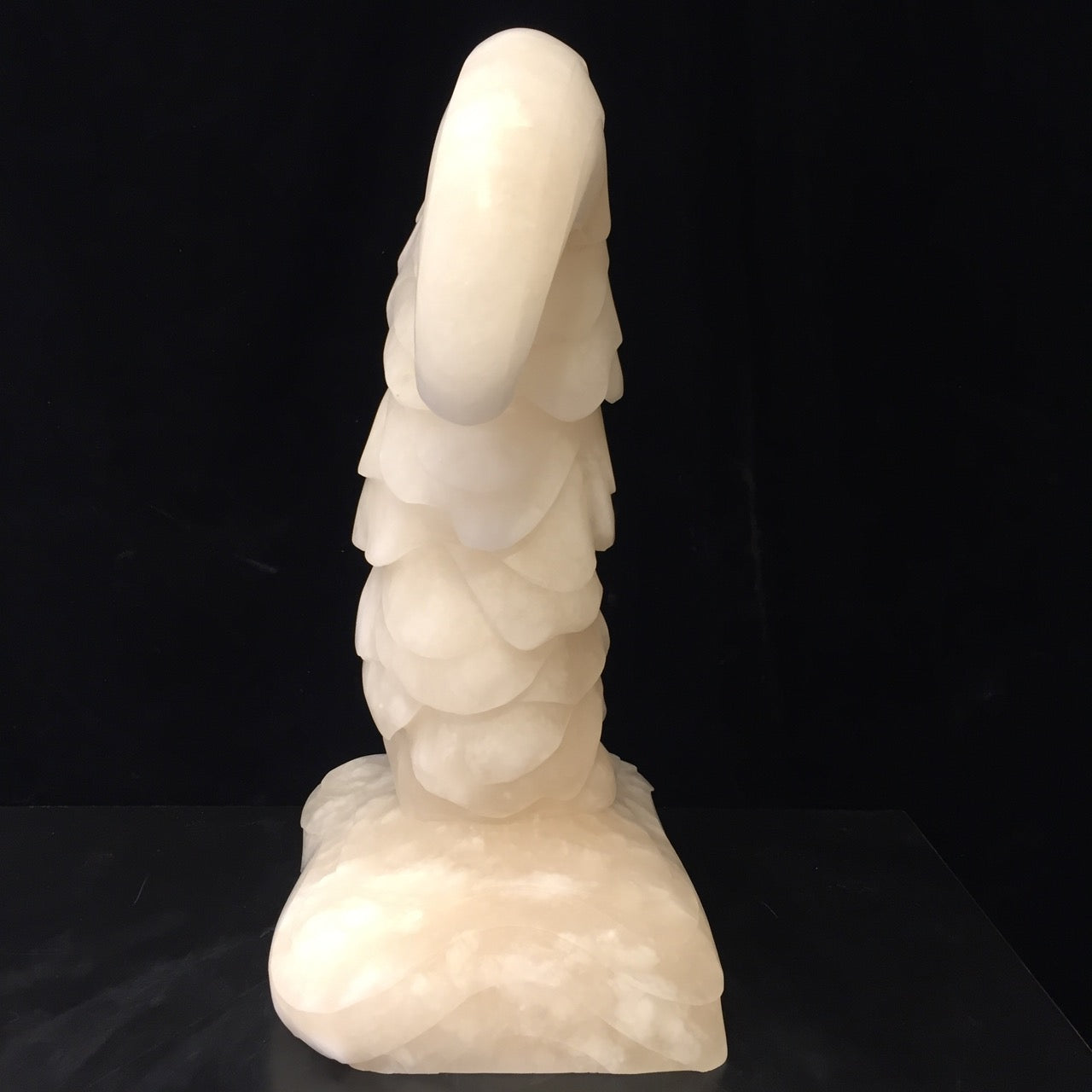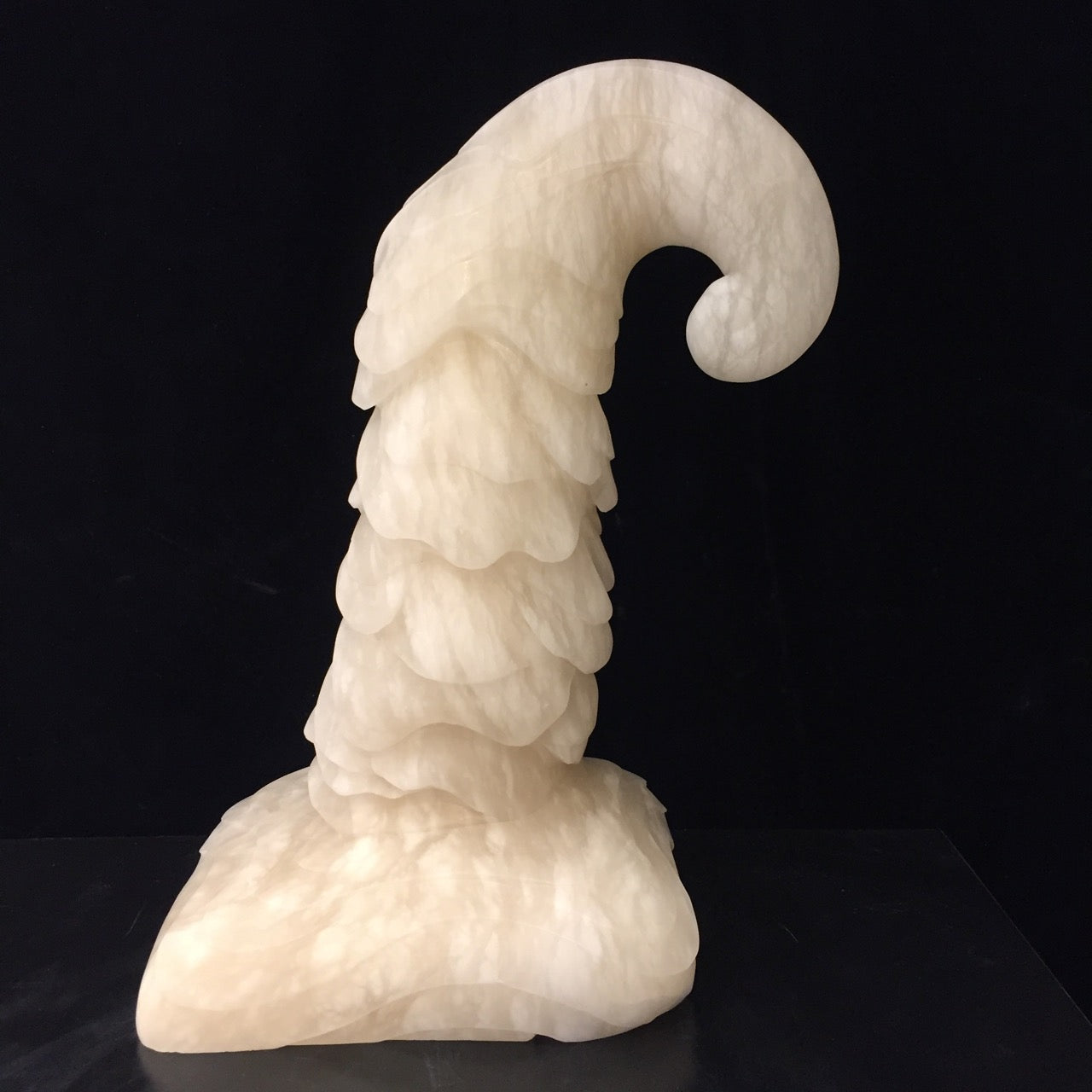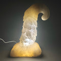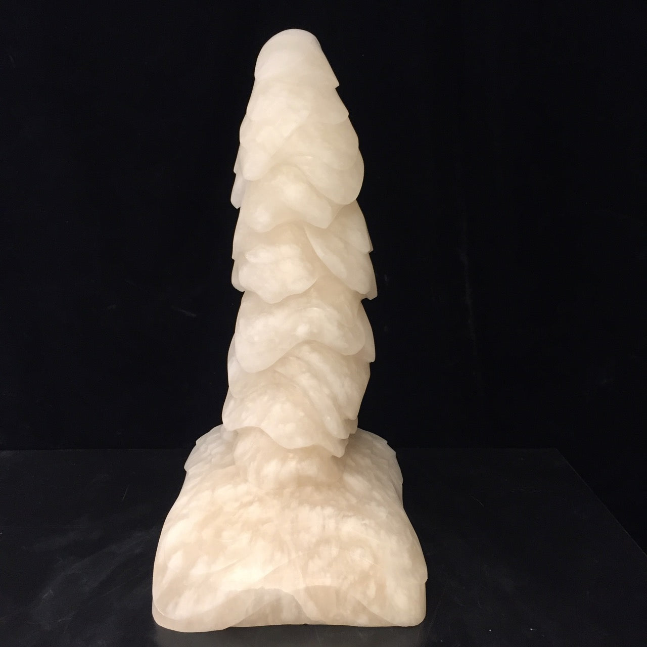 "Big White Snow Tree" is an enchanting sculpture that doubles as an artful light fixture, designed to evoke the serene beauty of snow-covered trees on Whistler Mountain. Crafted from Italian white alabaster, the piece radiates a soft, ethereal glow when illuminated, accentuating the stone's natural translucency. The swirling, layered design mimics the delicate accumulation of snow on tree branches, creating a sense of movement and tranquility. Measuring 10" x 8" x 16" and weighing 29 lbs, this sculpture is a substantial yet graceful addition to any space. The integration of LED lighting allows it to transform from a captivating daytime sculpture to a luminous nighttime centerpiece. This unique, one-of-a-kind piece not only captures the essence of winter's beauty but also brings a functional elegance to its surroundings.