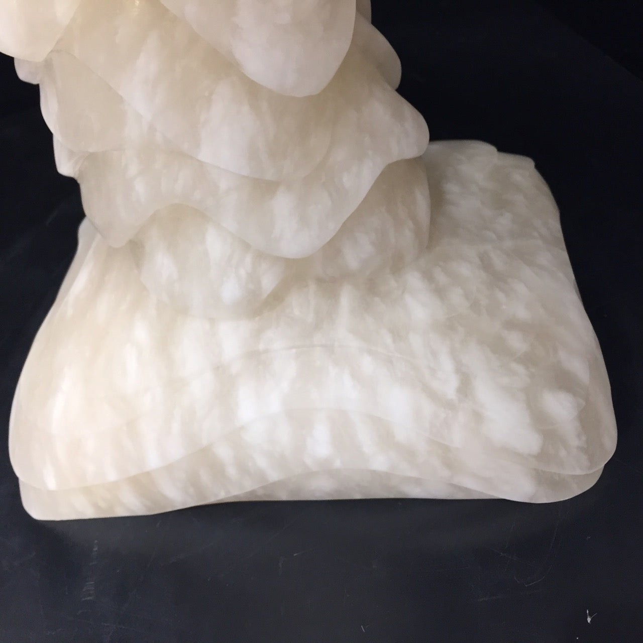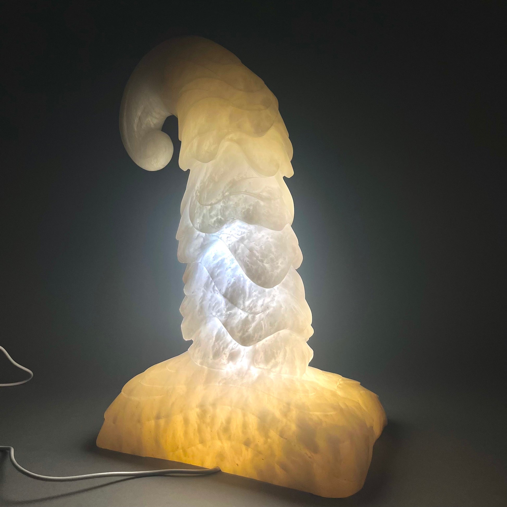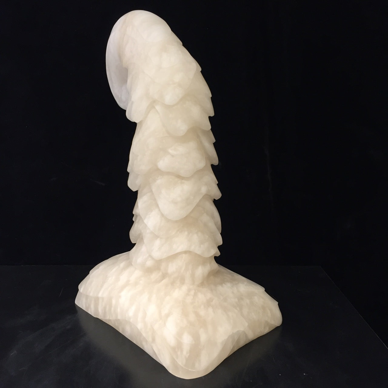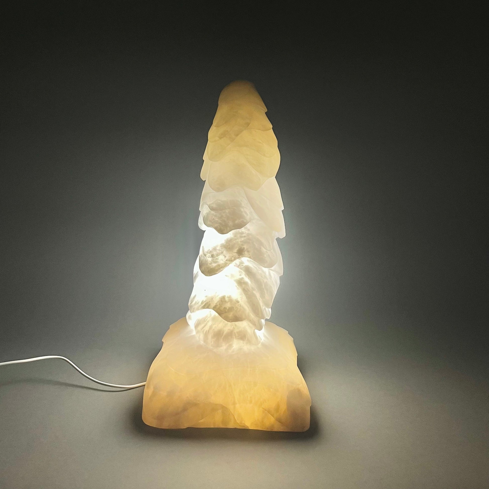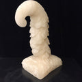 "Big White Snow Tree" is an enchanting sculpture that doubles as an artful light fixture, designed to evoke the serene beauty of snow-covered trees on Whistler Mountain. Crafted from Italian white alabaster, the piece radiates a soft, ethereal glow when illuminated, accentuating the stone's natural translucency. The swirling, layered design mimics the delicate accumulation of snow on tree branches, creating a sense of movement and tranquility. Measuring 10" x 8" x 16" and weighing 29 lbs, this sculpture is a substantial yet graceful addition to any space. The integration of LED lighting allows it to transform from a captivating daytime sculpture to a luminous nighttime centerpiece. This unique, one-of-a-kind piece not only captures the essence of winter's beauty but also brings a functional elegance to its surroundings.