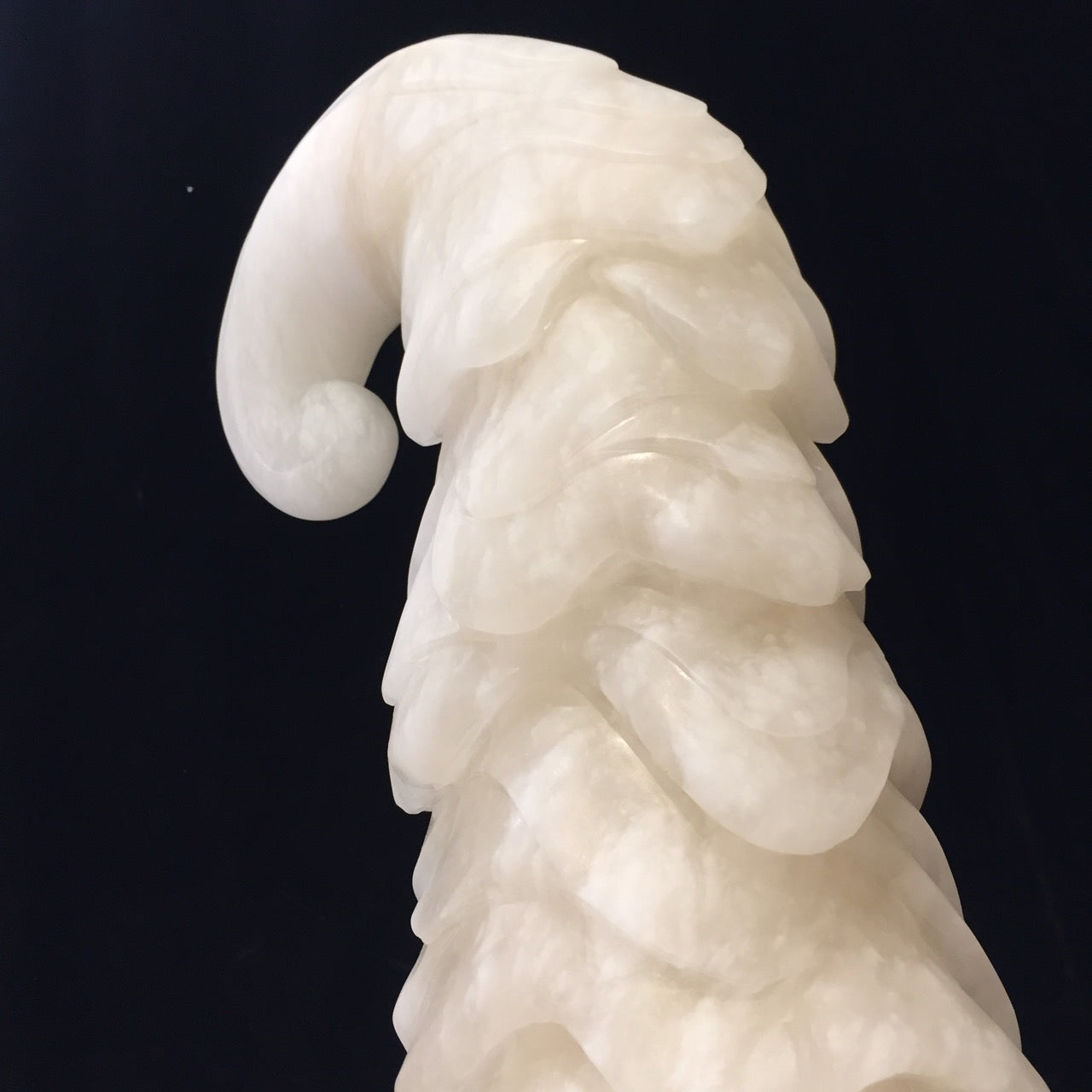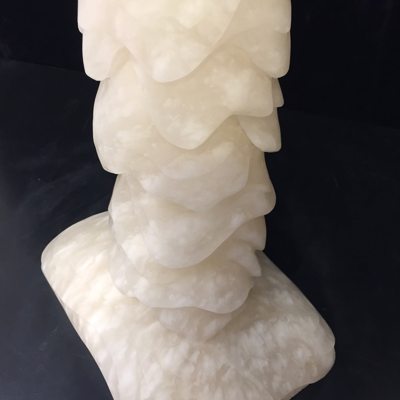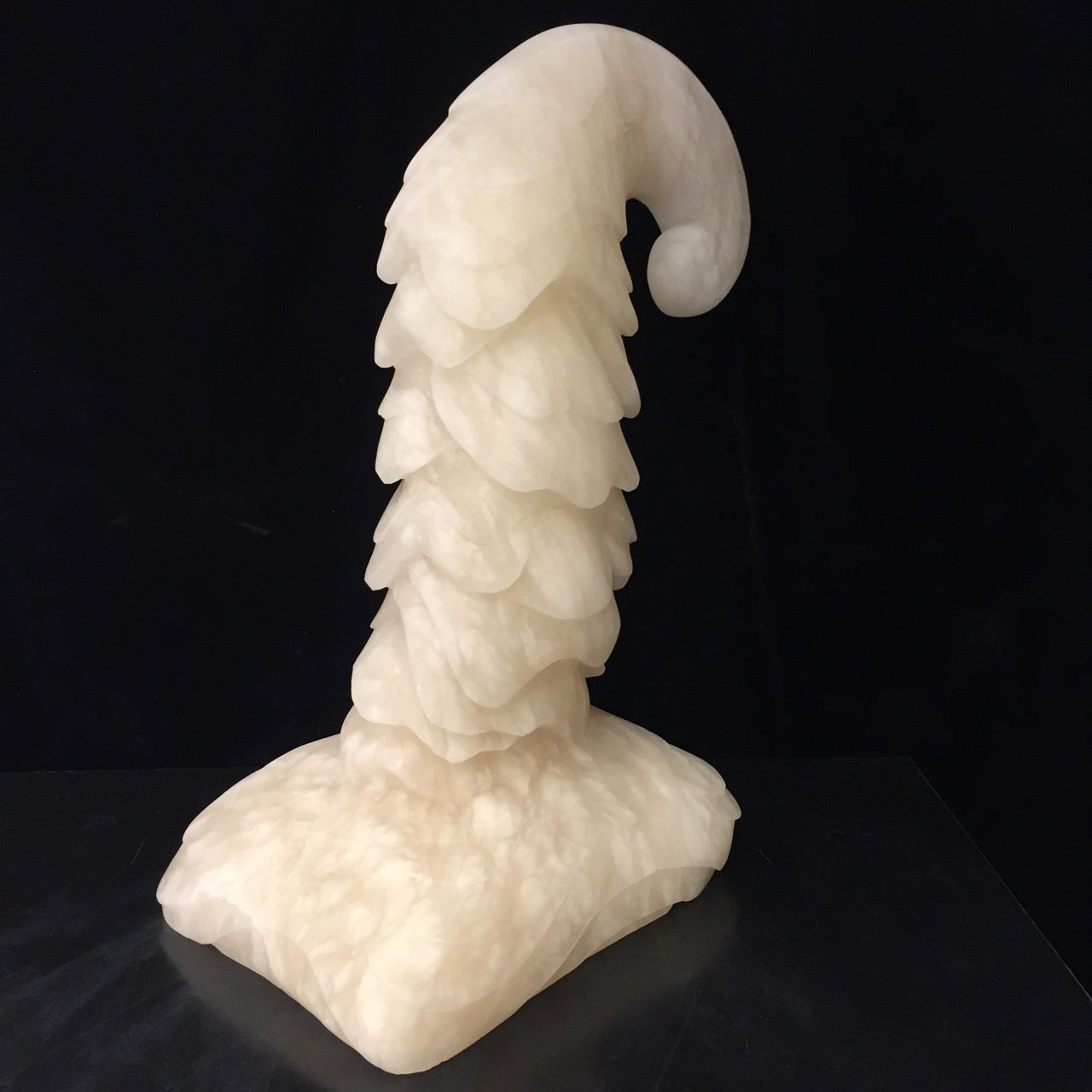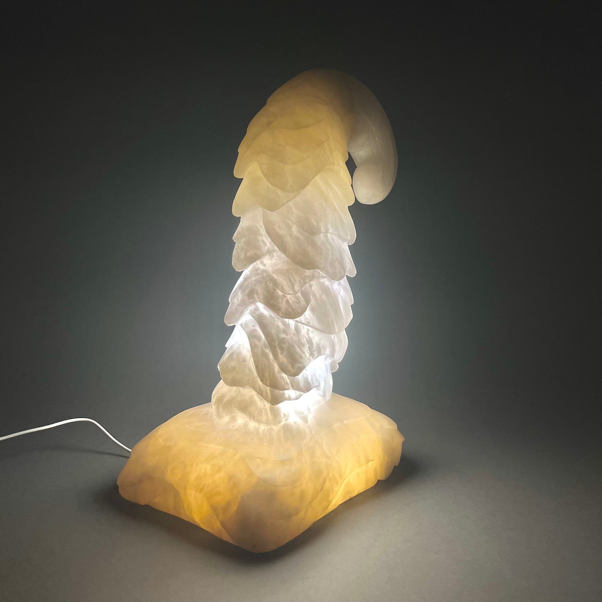 "Big White Snow Tree" is an enchanting sculpture that doubles as an artful light fixture, designed to evoke the serene beauty of snow-covered trees on Whistler Mountain. Crafted from Italian white alabaster, the piece radiates a soft, ethereal glow when illuminated, accentuating the stone's natural translucency. The swirling, layered design mimics the delicate accumulation of snow on tree branches, creating a sense of movement and tranquility. Measuring 10" x 8" x 16" and weighing 29 lbs, this sculpture is a substantial yet graceful addition to any space. The integration of LED lighting allows it to transform from a captivating daytime sculpture to a luminous nighttime centerpiece. This unique, one-of-a-kind piece not only captures the essence of winter's beauty but also brings a functional elegance to its surroundings.