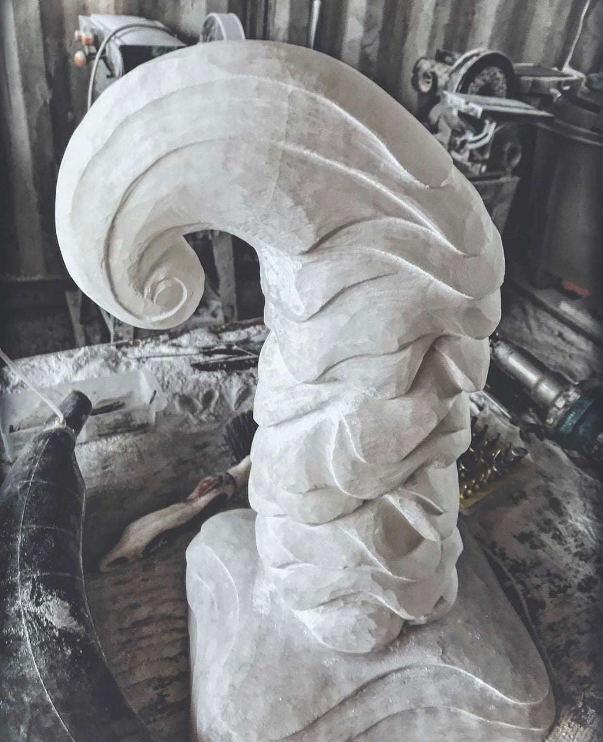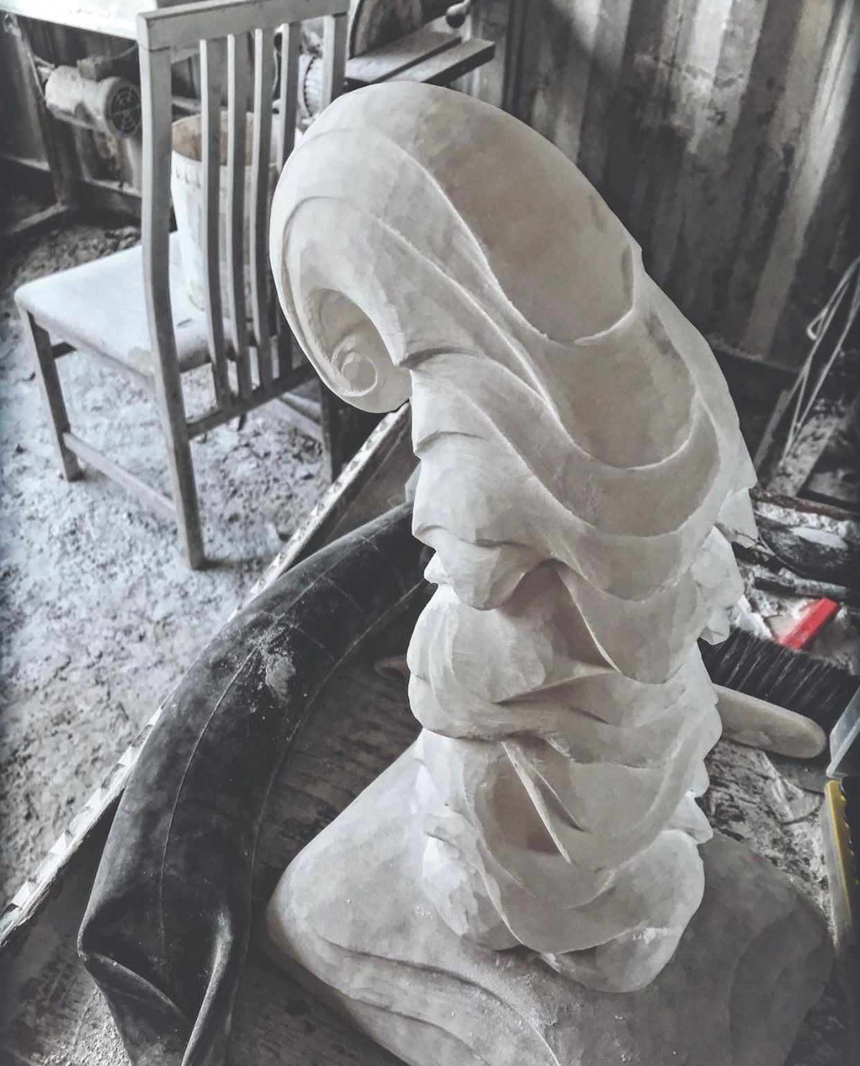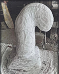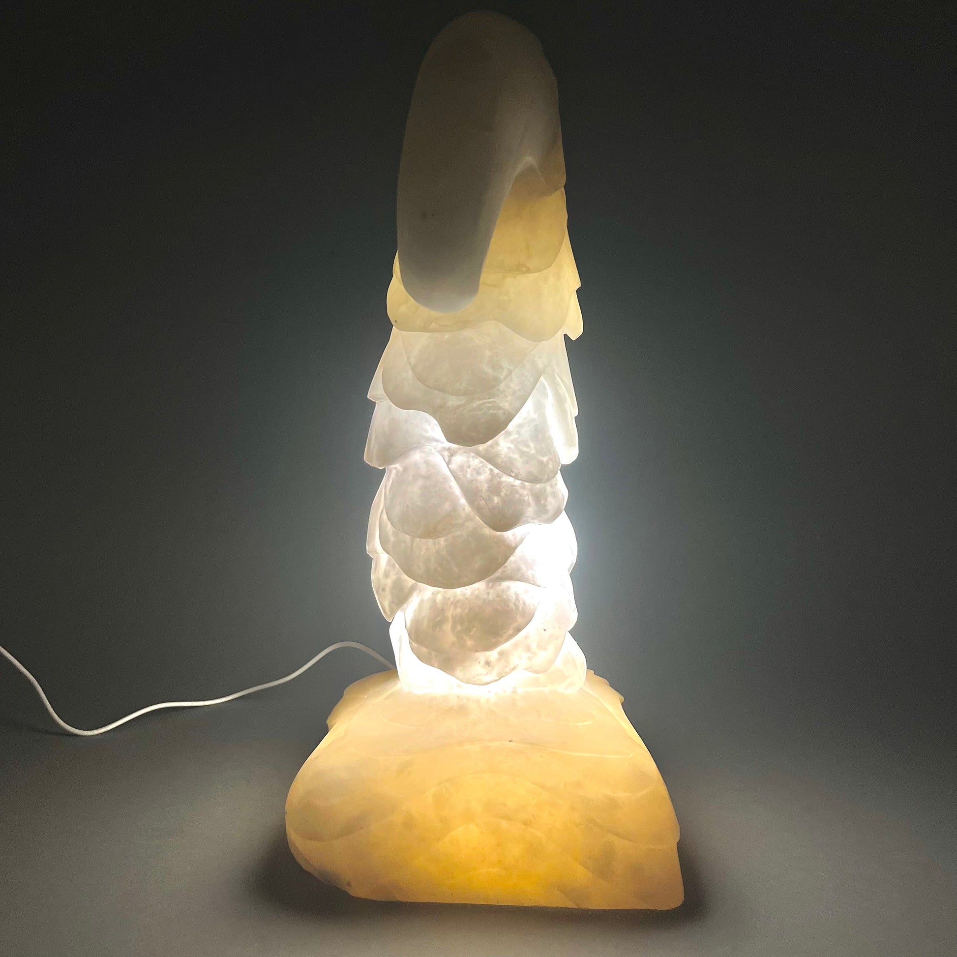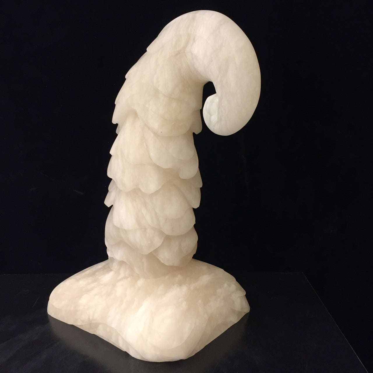 "Big White Snow Tree" is an enchanting sculpture that doubles as an artful light fixture, designed to evoke the serene beauty of snow-covered trees on Whistler Mountain. Crafted from Italian white alabaster, the piece radiates a soft, ethereal glow when illuminated, accentuating the stone's natural translucency. The swirling, layered design mimics the delicate accumulation of snow on tree branches, creating a sense of movement and tranquility. Measuring 10" x 8" x 16" and weighing 29 lbs, this sculpture is a substantial yet graceful addition to any space. The integration of LED lighting allows it to transform from a captivating daytime sculpture to a luminous nighttime centerpiece. This unique, one-of-a-kind piece not only captures the essence of winter's beauty but also brings a functional elegance to its surroundings.