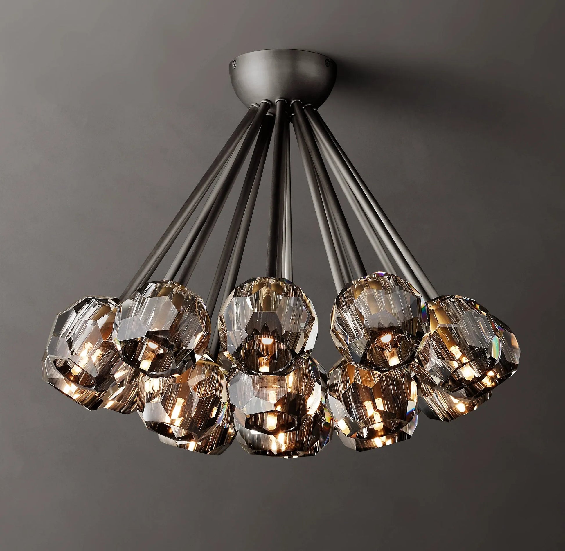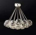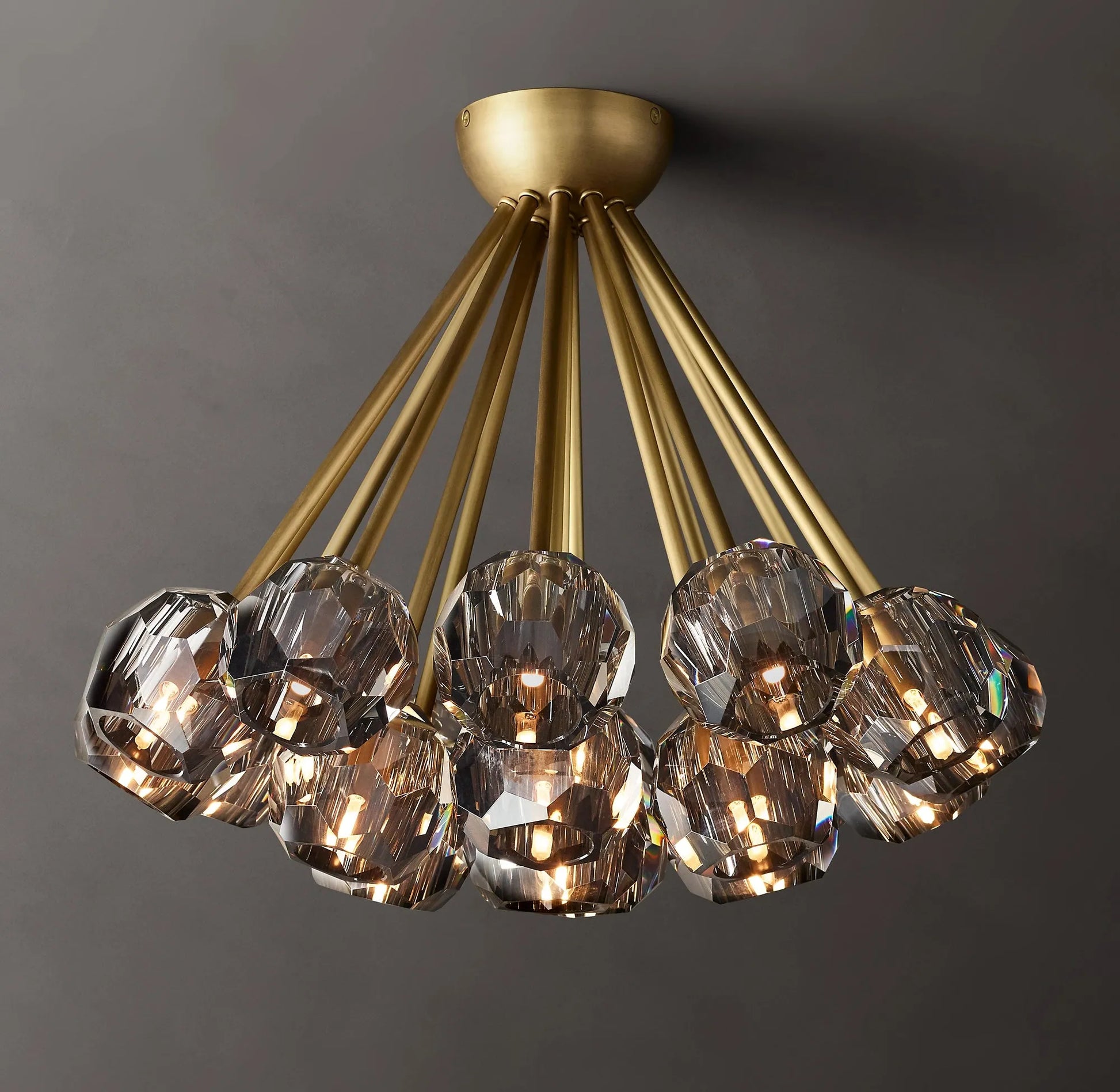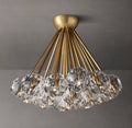 This chandelier is constructed of solid brass and clear K9 glass, a type of crystal used to make optical lenses and prisms. Evoking the spirit of minimalist design, each finely faceted sphere is hand-ground and polished to reflect and refract light.
