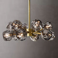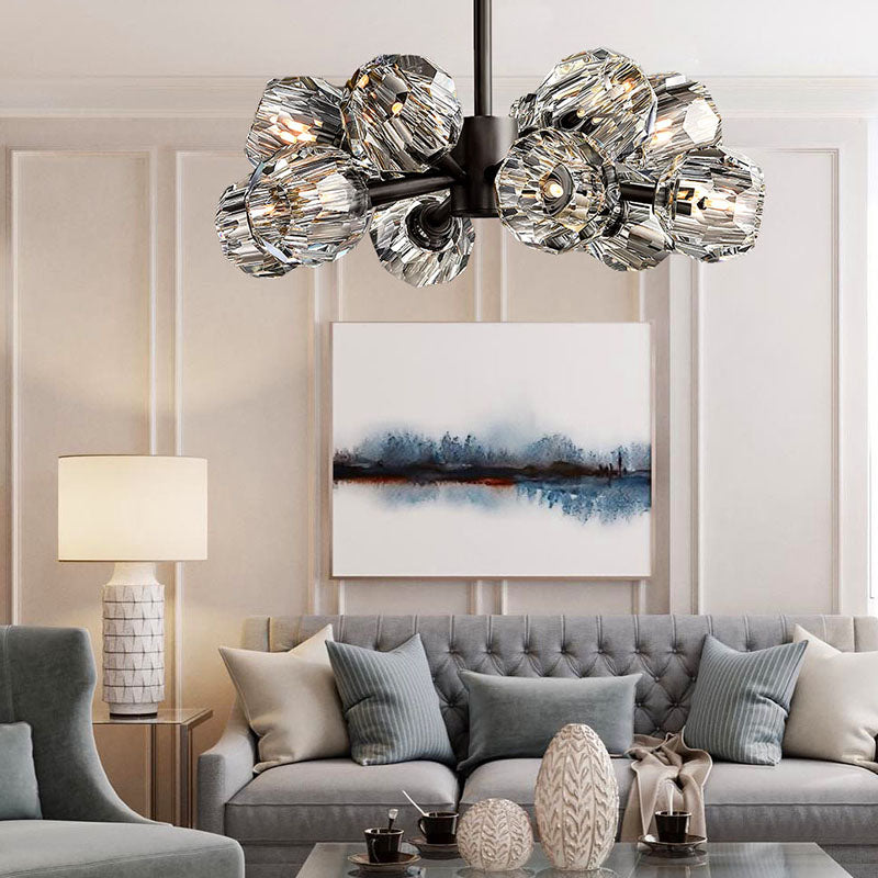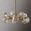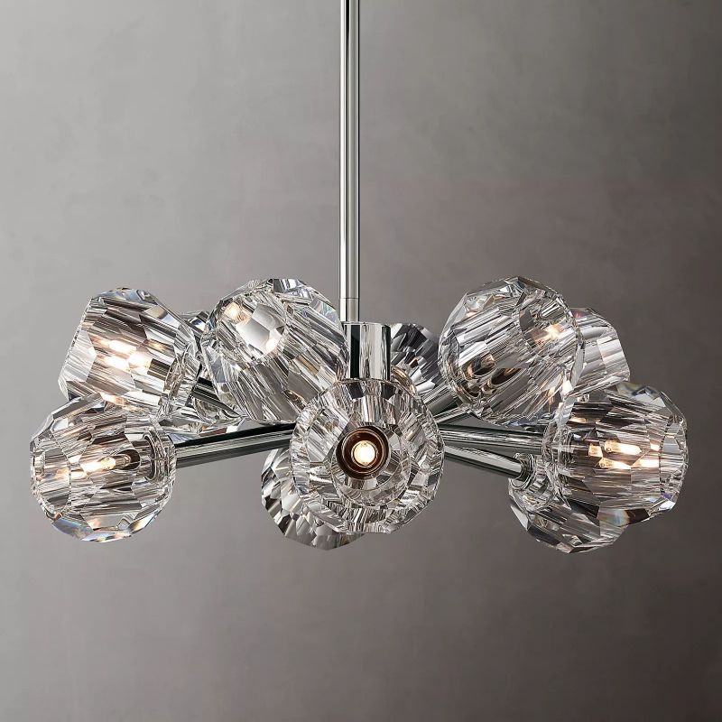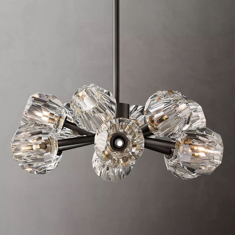 This chandelier is constructed of solid brass and clear K9 glass, a type of crystal used to make optical lenses and prisms. Evoking the spirit of minimalist design, each finely faceted sphere is hand-ground and polished to reflect and refract light.