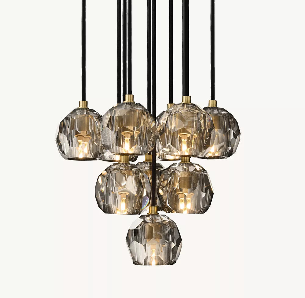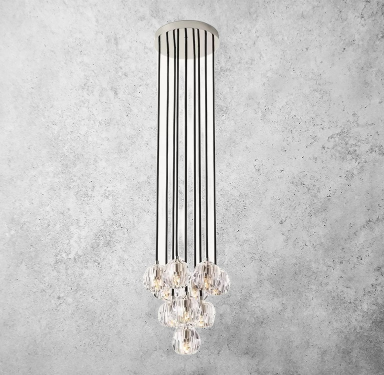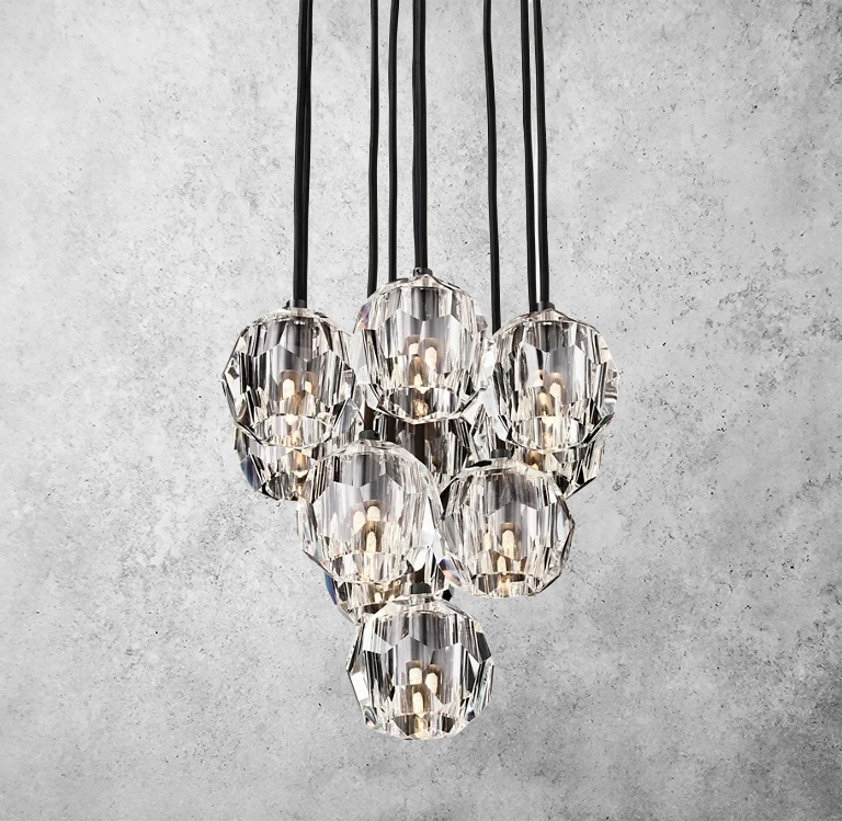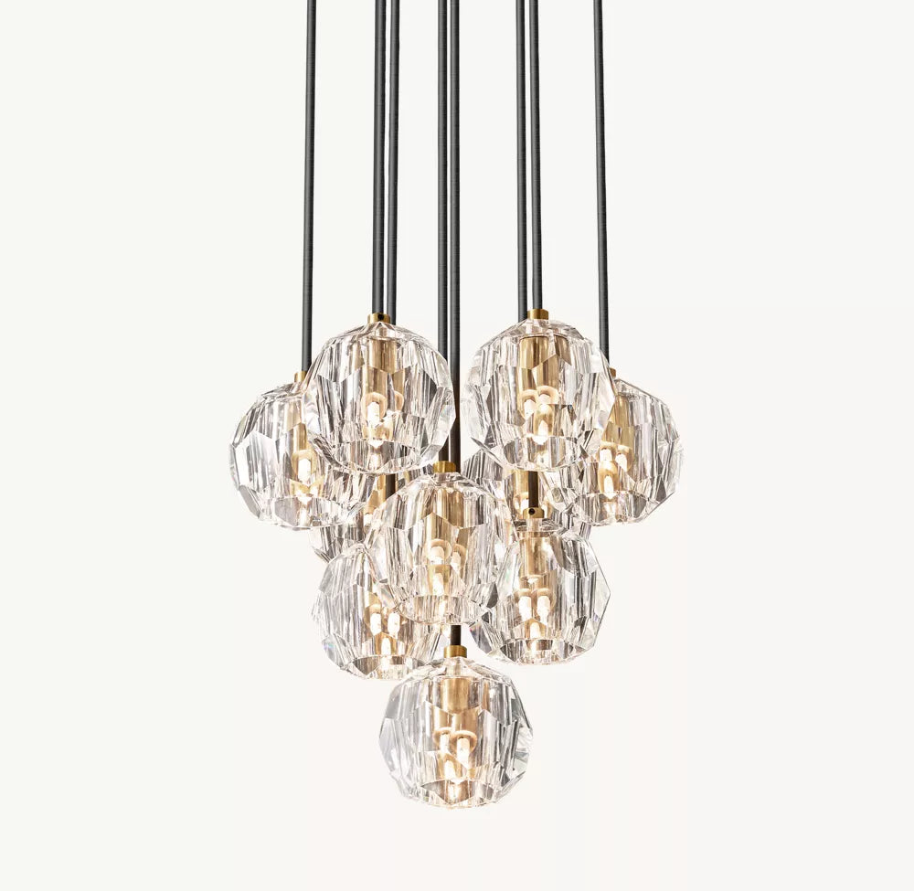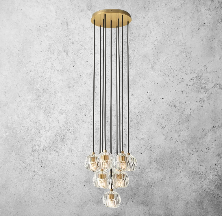 Crafted of solid brass and crystal glass, the sculptural fixture is a testament to our passion for luxe materials and superior craftsmanship. Evoking the minimalist spirit of 1960s design, each finely faceted sphere is ground and polished by hand to reflect and refract the light.