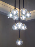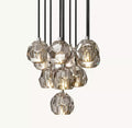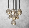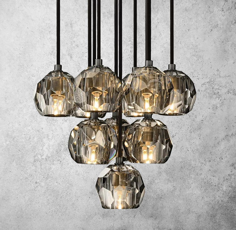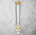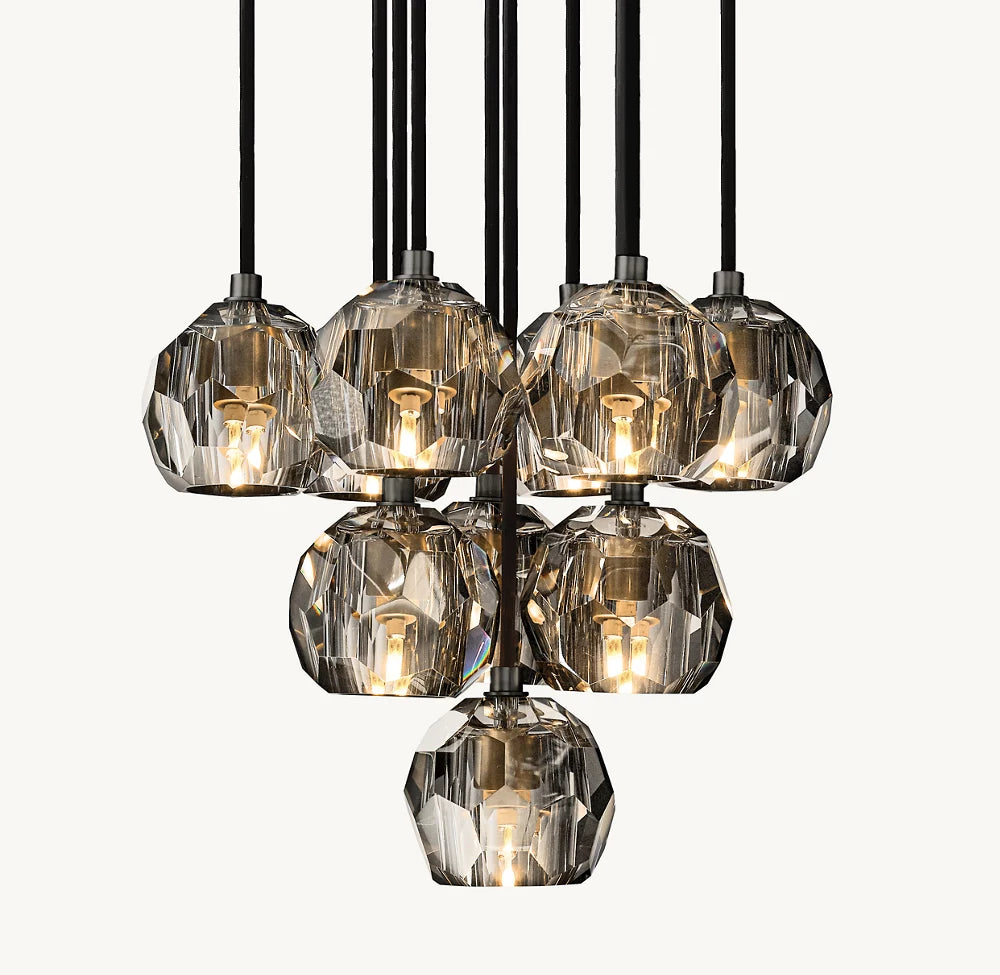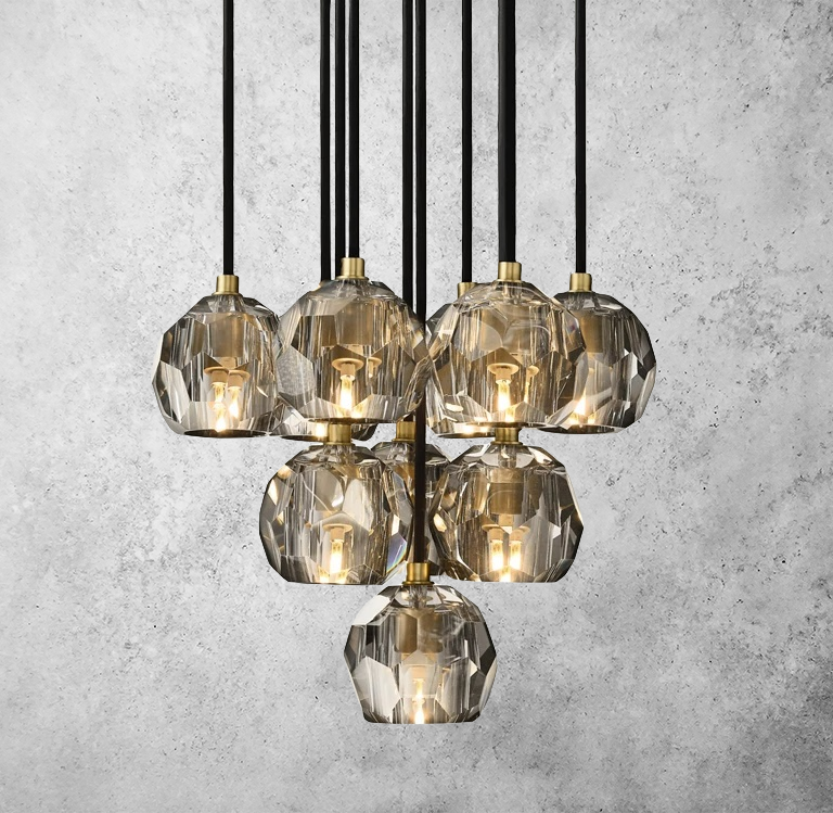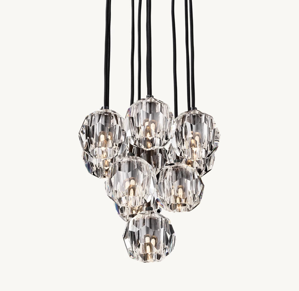 Crafted of solid brass and crystal glass, the sculptural fixture is a testament to our passion for luxe materials and superior craftsmanship. Evoking the minimalist spirit of 1960s design, each finely faceted sphere is ground and polished by hand to reflect and refract the light.