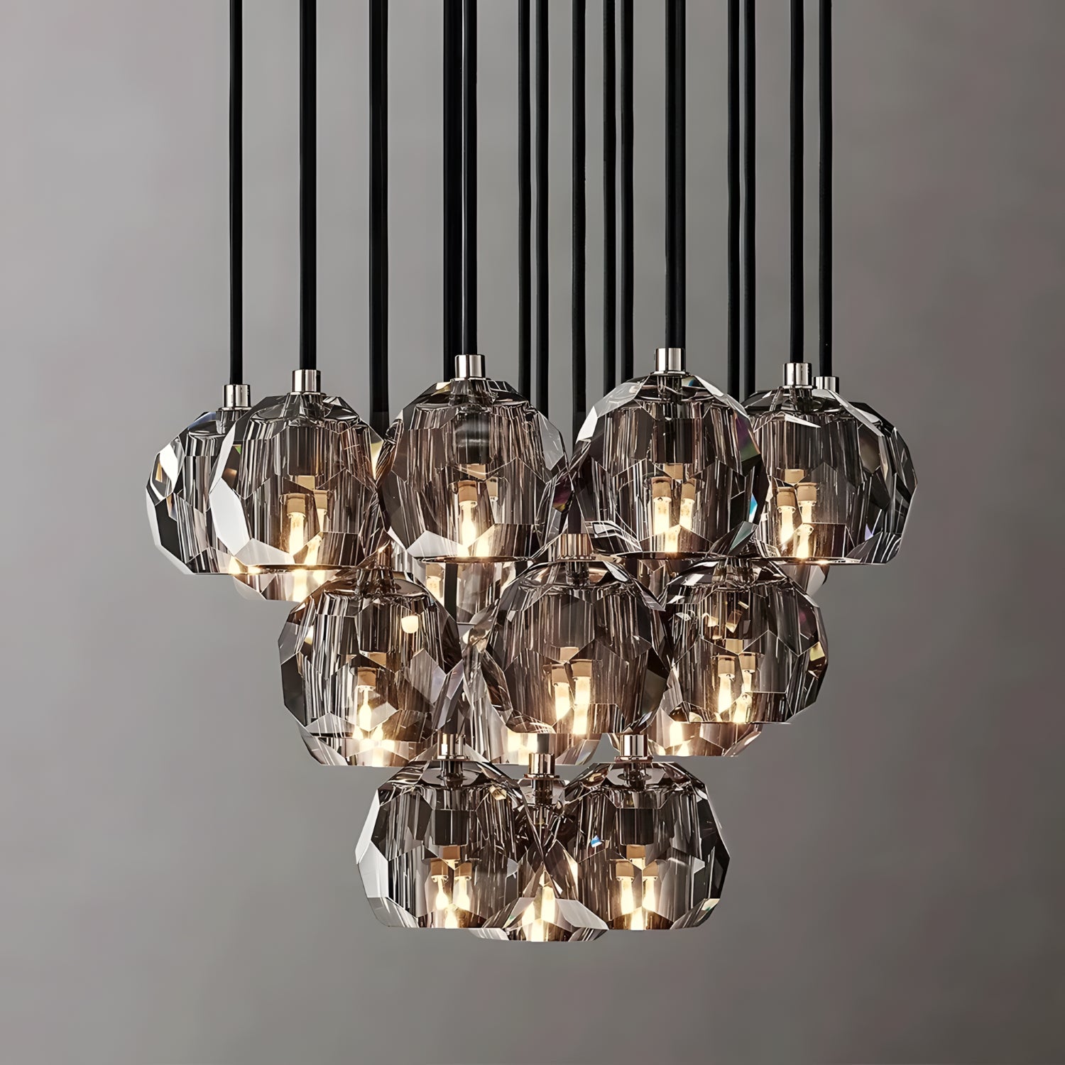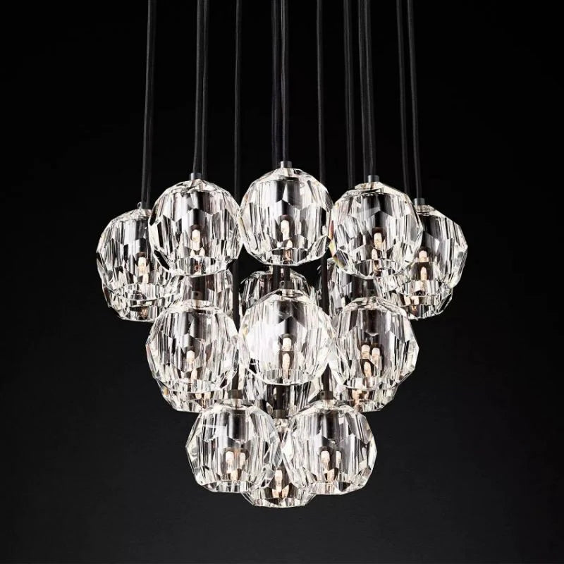 Crafted of solid brass and crystal glass, the sculptural fixture is a testament to our passion for luxe materials and superior craftsmanship. Evoking the minimalist spirit of 1960s design, each finely faceted sphere is ground and polished by hand to reflect and refract the light.
