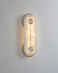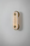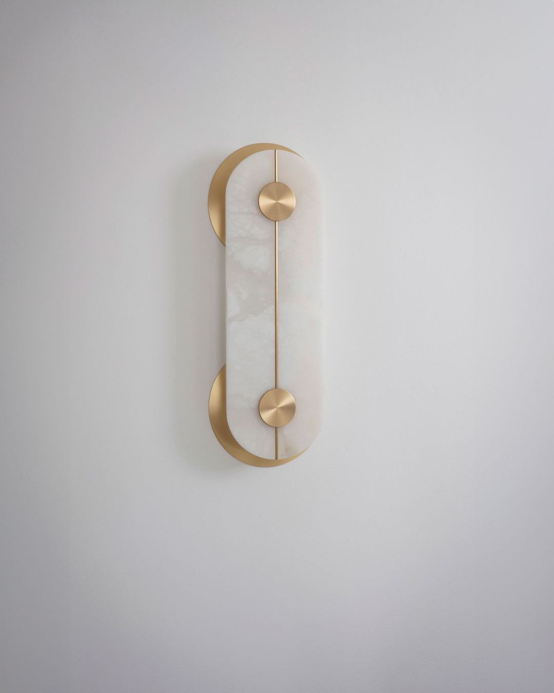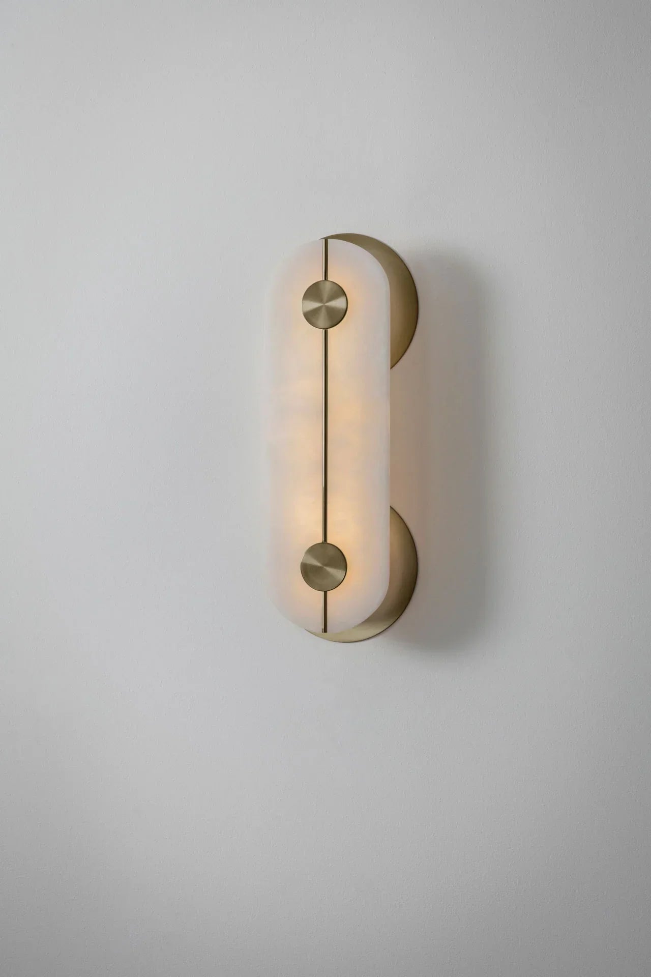 The Brace wall light by Bert Frank features rounded sheet of alabaster, braced by brass bobbins. This elegant wall light is characterised by symmetrical, geometric details. In the initial sketches Brace started off as an African shield, which gradually became honed back to this pure ‘pill’ shape. Designed to cast both a warm wash of light across the wall and illuminate into the room, each piece of alabaster is different so the diffused light has infinite variety. Available in two sizes, the Brace wall light has a IP44 rating and is suitable for wet areas.