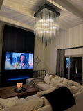 | In this collection, crystal and metal rods cascade and coexist as hundreds of slender tubes are hung asymmetrically from a smooth canopy, refracting dramatically and artfully evoking rainfall frozen in time. |