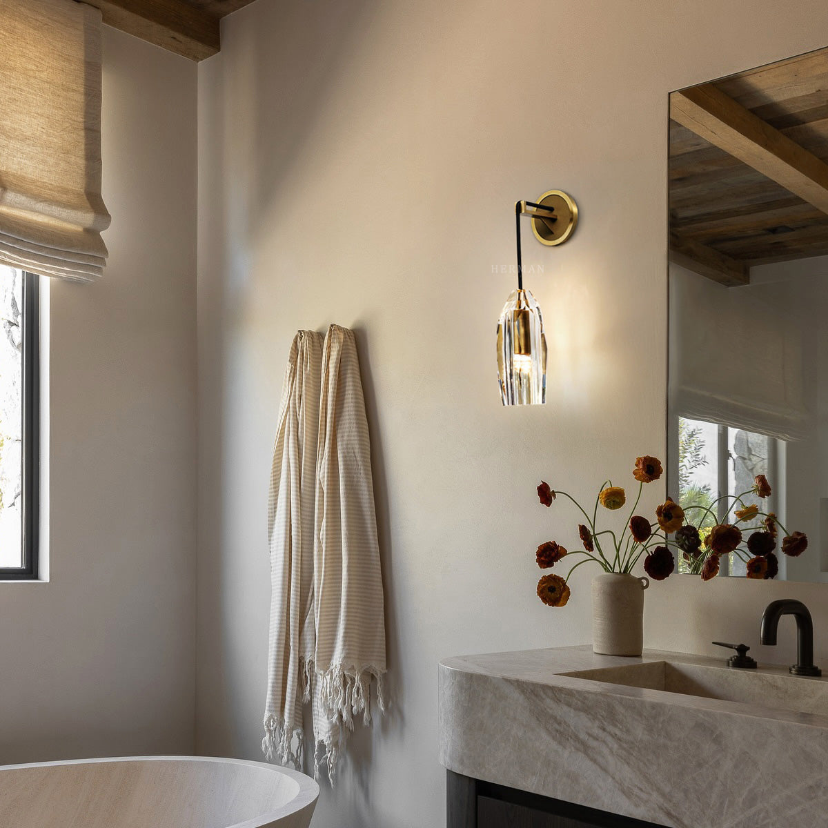 The Chap Wall Sconce is machined from solid brass. All parts are hand polished and patina’d. The lead crystal shade is hand polished.