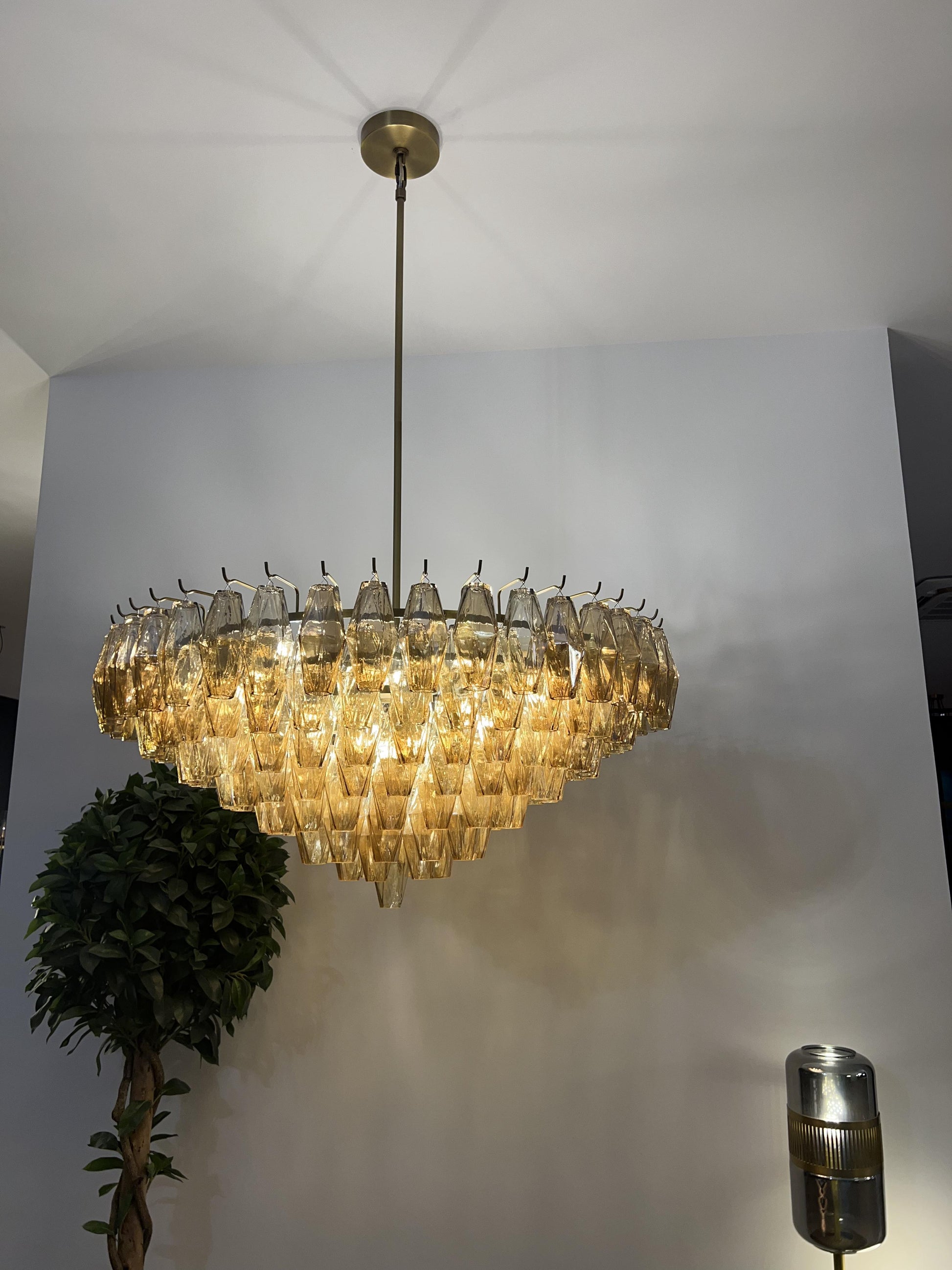 The chandelier is suspended from a tiered steel frame with dozens of hand-blown glass polyhedra on individual hooks. Illuminated from within, the faceted chandeliers dramatically reflect and refract light. A tribute to the Italian lighting style of the 1950s with this minimalist style.