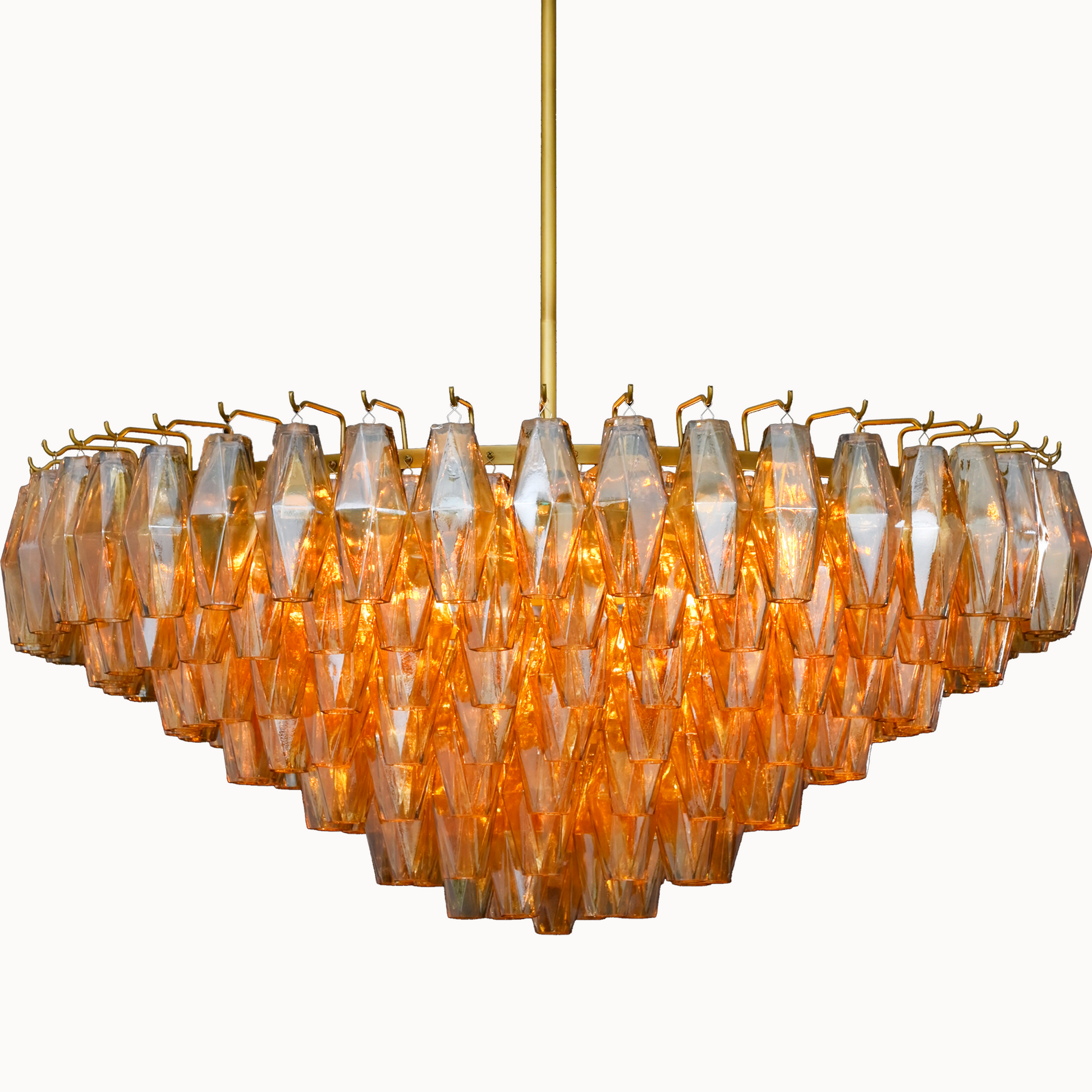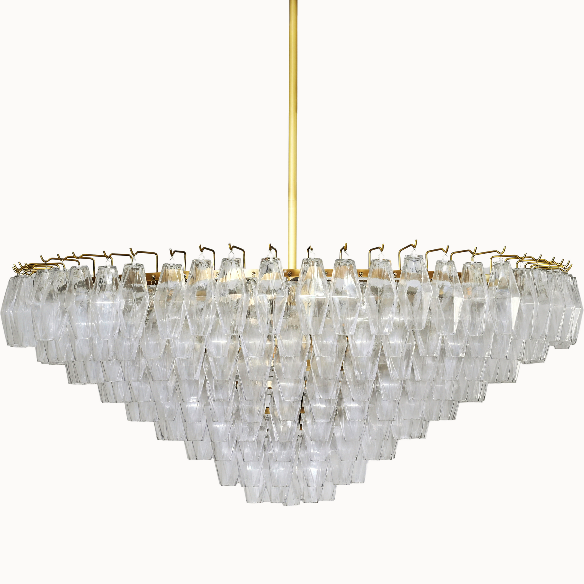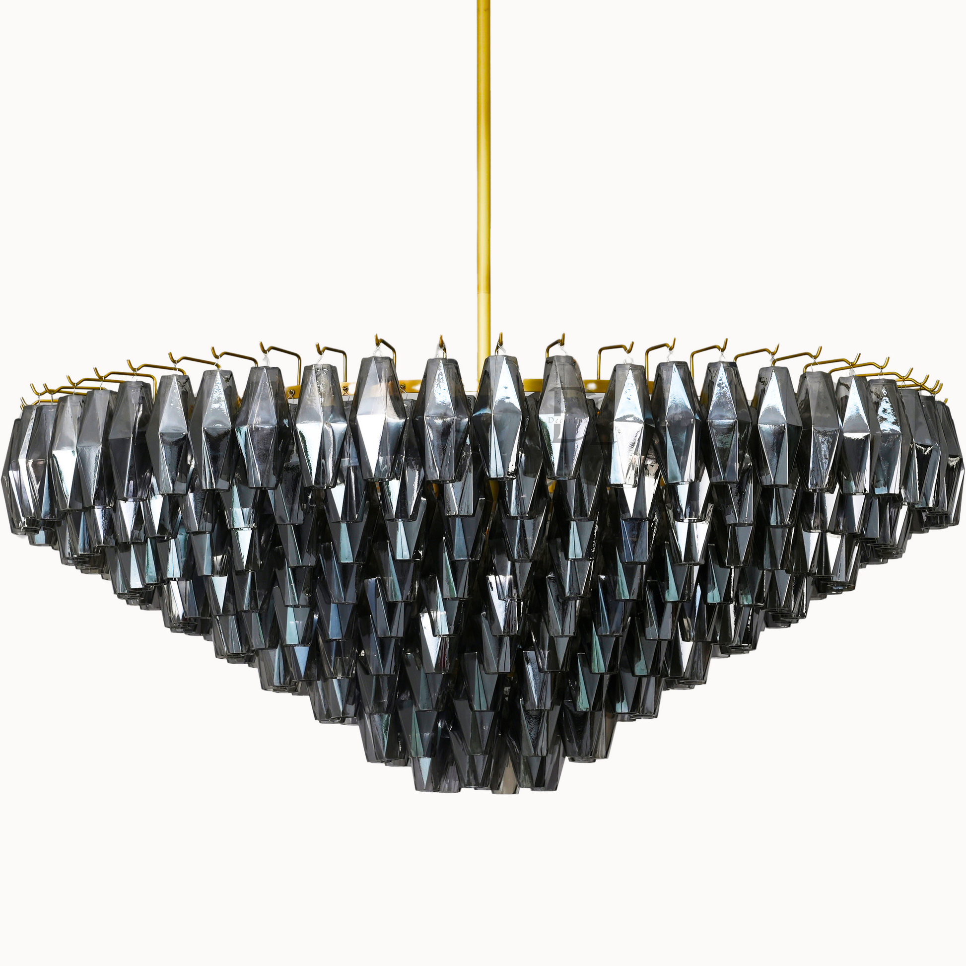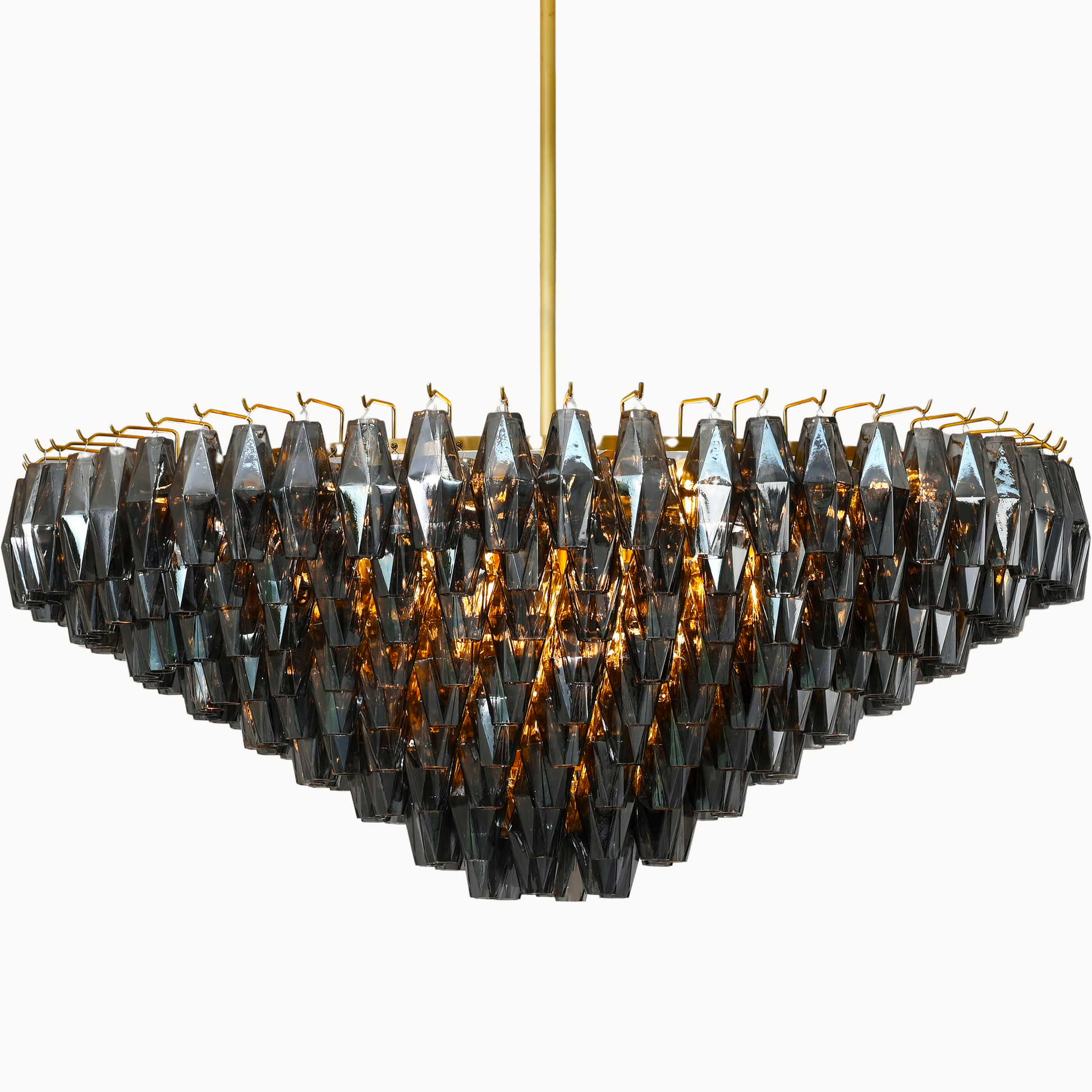 Our fixtures celebrate the minimalist spirit of the period in a grand way. From a cascading steel frame, dozens of hand-blown glass polyhedra hang from individual hooks. Illuminated from within, the faceted chandelier greatly reflects and refracts light.