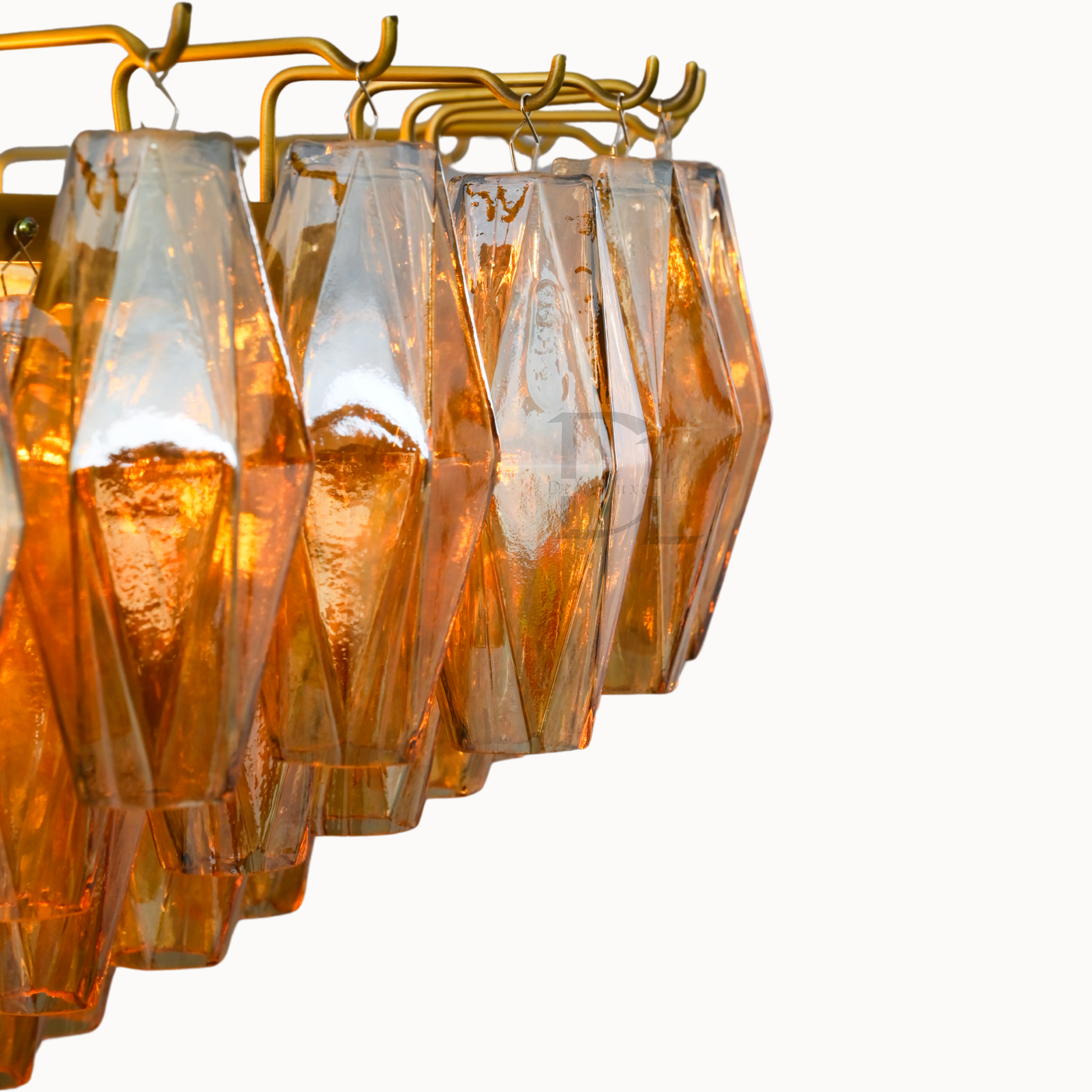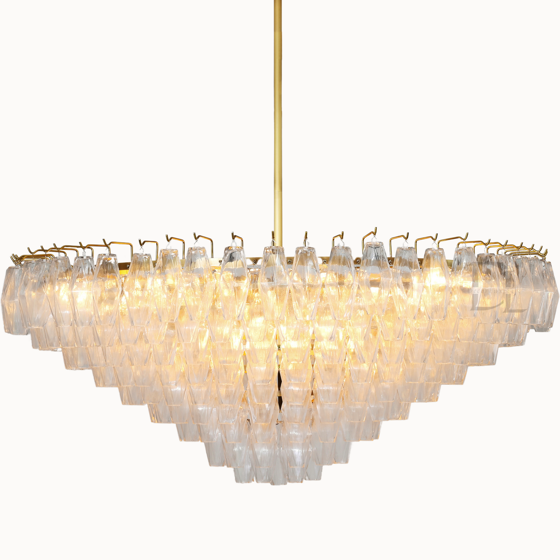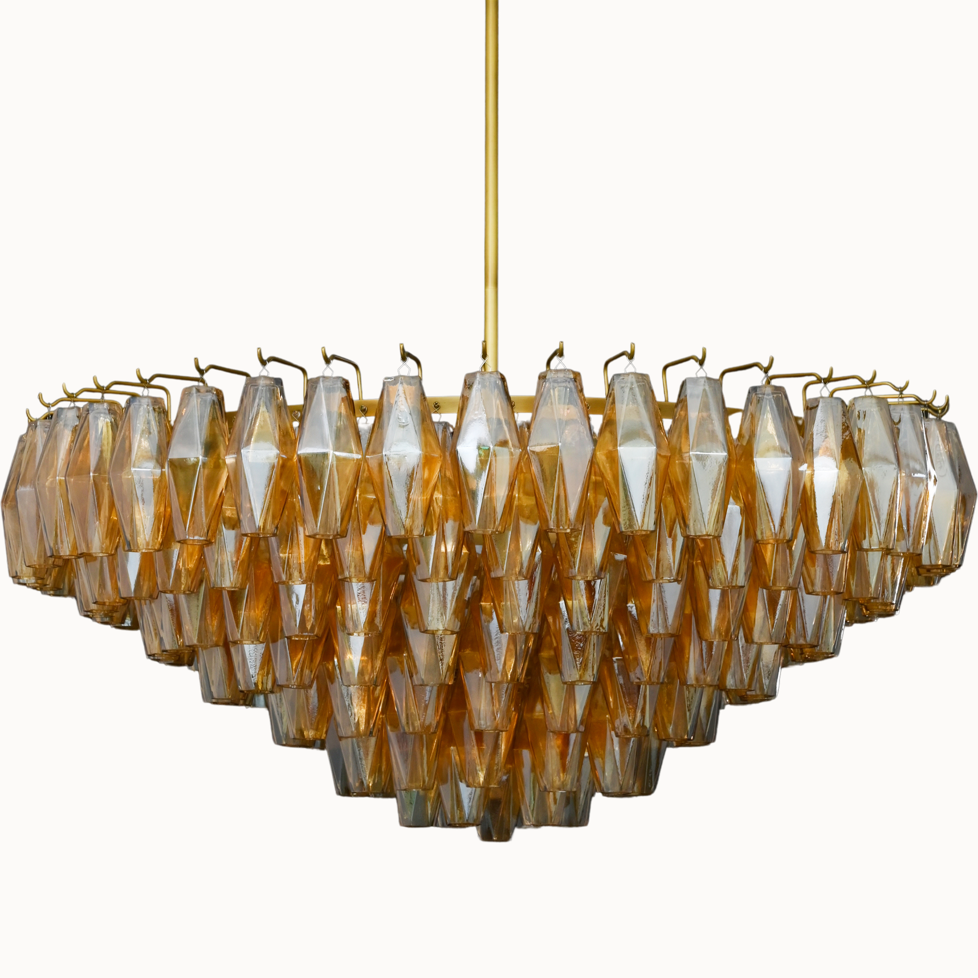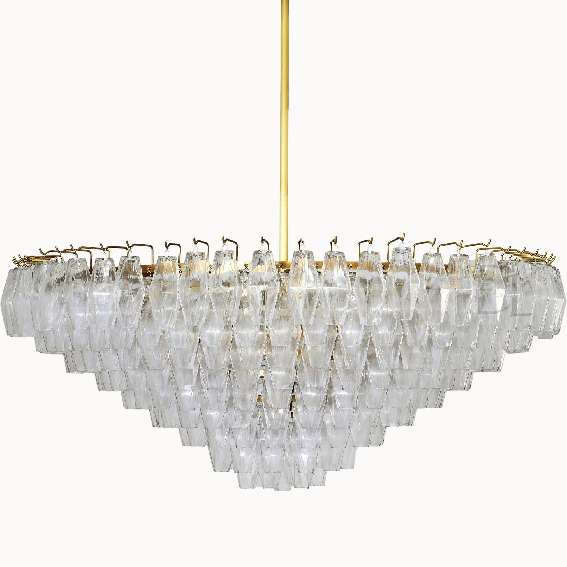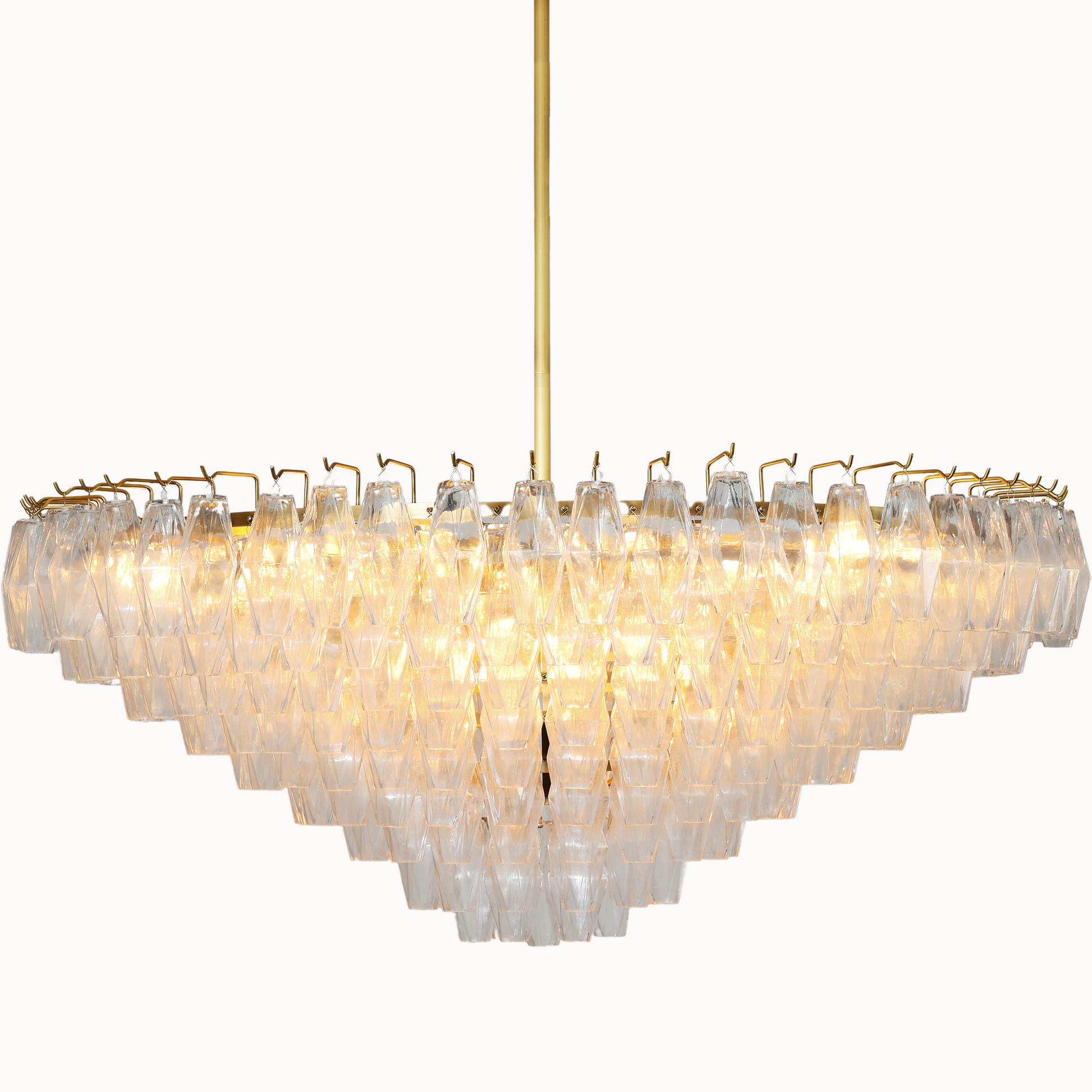 Our fixtures celebrate the minimalist spirit of the period in a grand way. From a cascading steel frame, dozens of hand-blown glass polyhedra hang from individual hooks. Illuminated from within, the faceted chandelier greatly reflects and refracts light.
