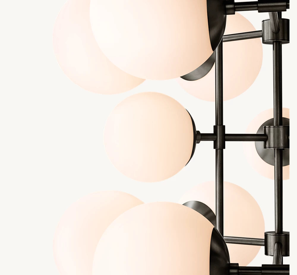 An elegant grouping of opal matte glass globes in varying sizes suspends from a refined frame in the Cirque collection. Arranged in tiers, its pure, modern form evokes celestial bodies floating in space.