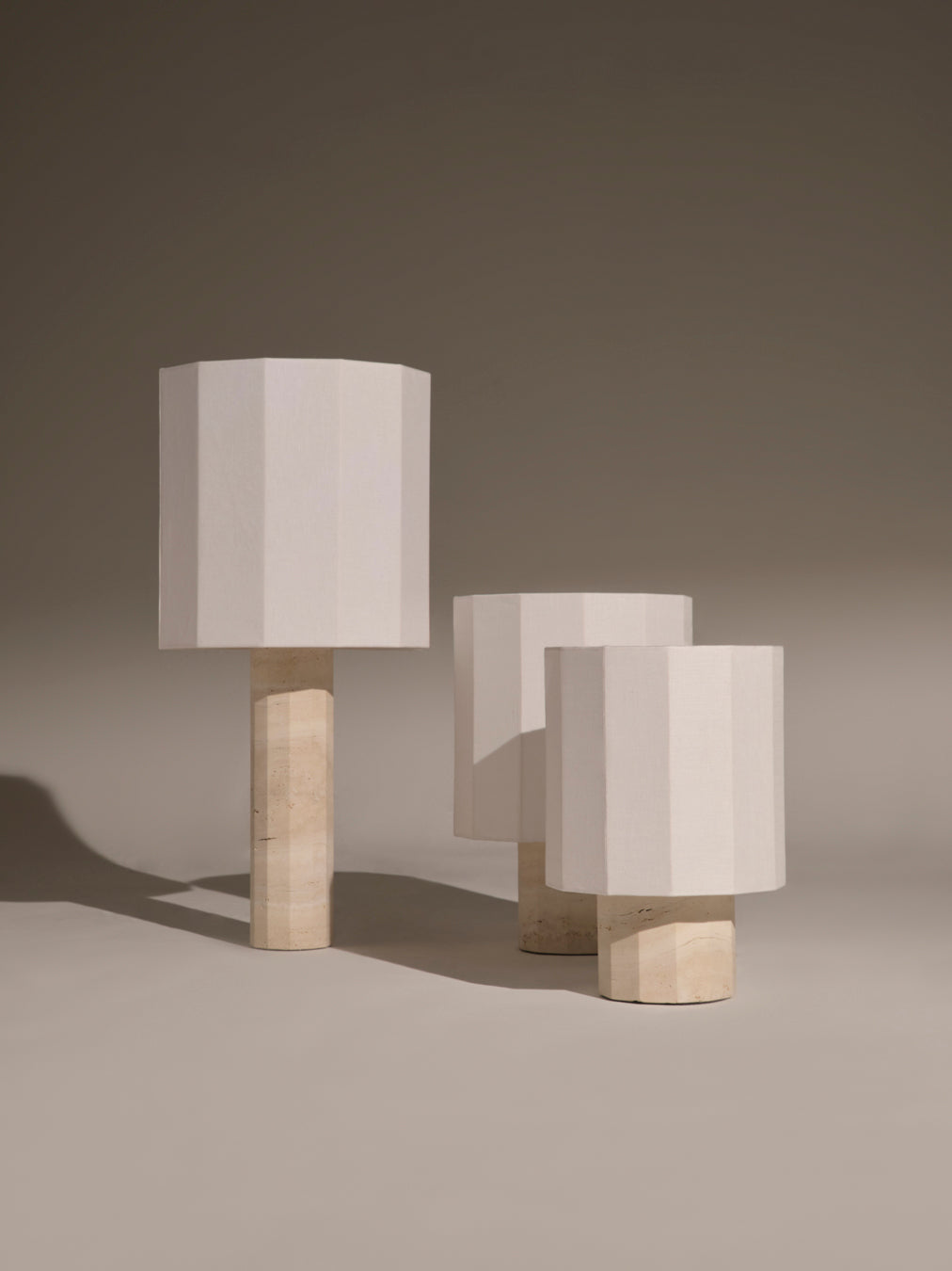 - Materials: Travertine, Linen, Cotton, Brass, Iron