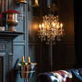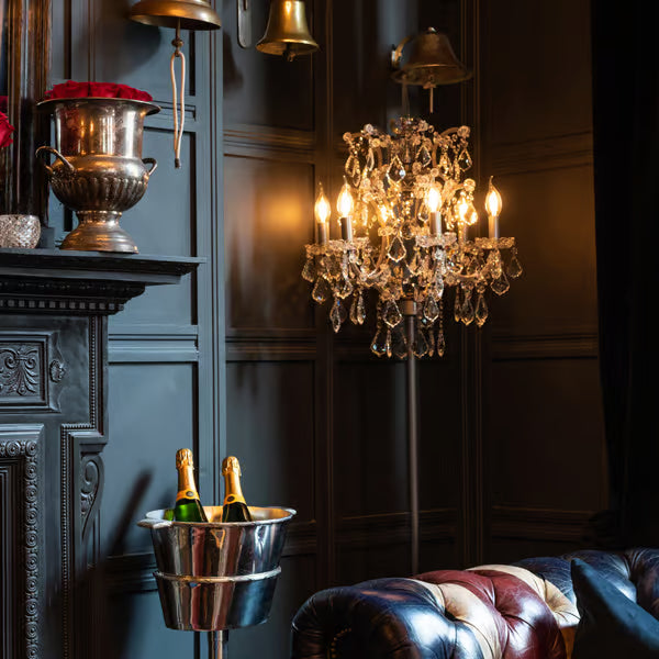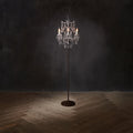 The crystal floor lamp features a large crystal balustrade-style column at its centre, complemented by meticulously cut crystal lamp beads, candlestick wicks and matching candlestick trays—the latter originally designed to collect melted wax. These exquisitely romantic details stand in striking contrast to our exclusive antique-patina metal finish, creating the distinctive Timothy Orton style that exudes authentic charm.