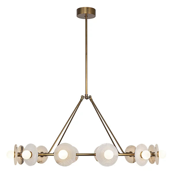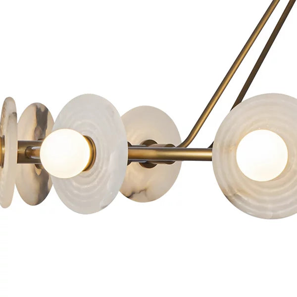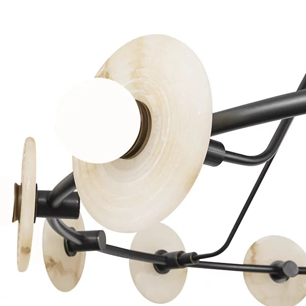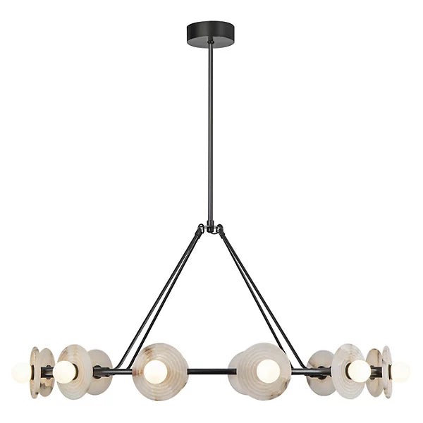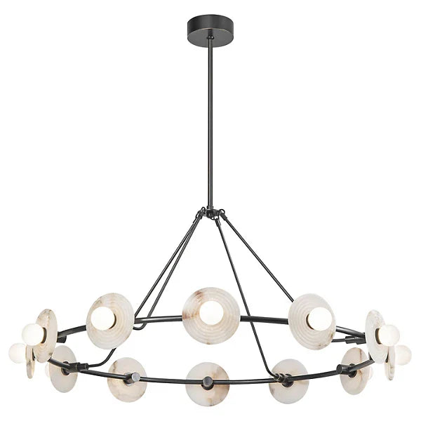 The Dahlia LED Chandelier by Alora Lighting draws inspiration from nature and a plant-loving aesthetic. A design by Alan Pepin that combines transitional and Mid-century Modern styles, the fixture features ribbed alabaster plates adorned with opal glass shades, like pearls, at their center, resulting in a daring, diffused mood lighting. Every detail is meticulously crafted to create a luxurious appearance that is destined to endure the test of time. Crafted from a steel understructure, it descends from a circular canopy via a central stem, extending slim arms to a horizontal ring. The alabaster surrounds glass shades, showcasing the unique variations in alabaster’s veining and tone and making each piece truly one-of-a-kind.