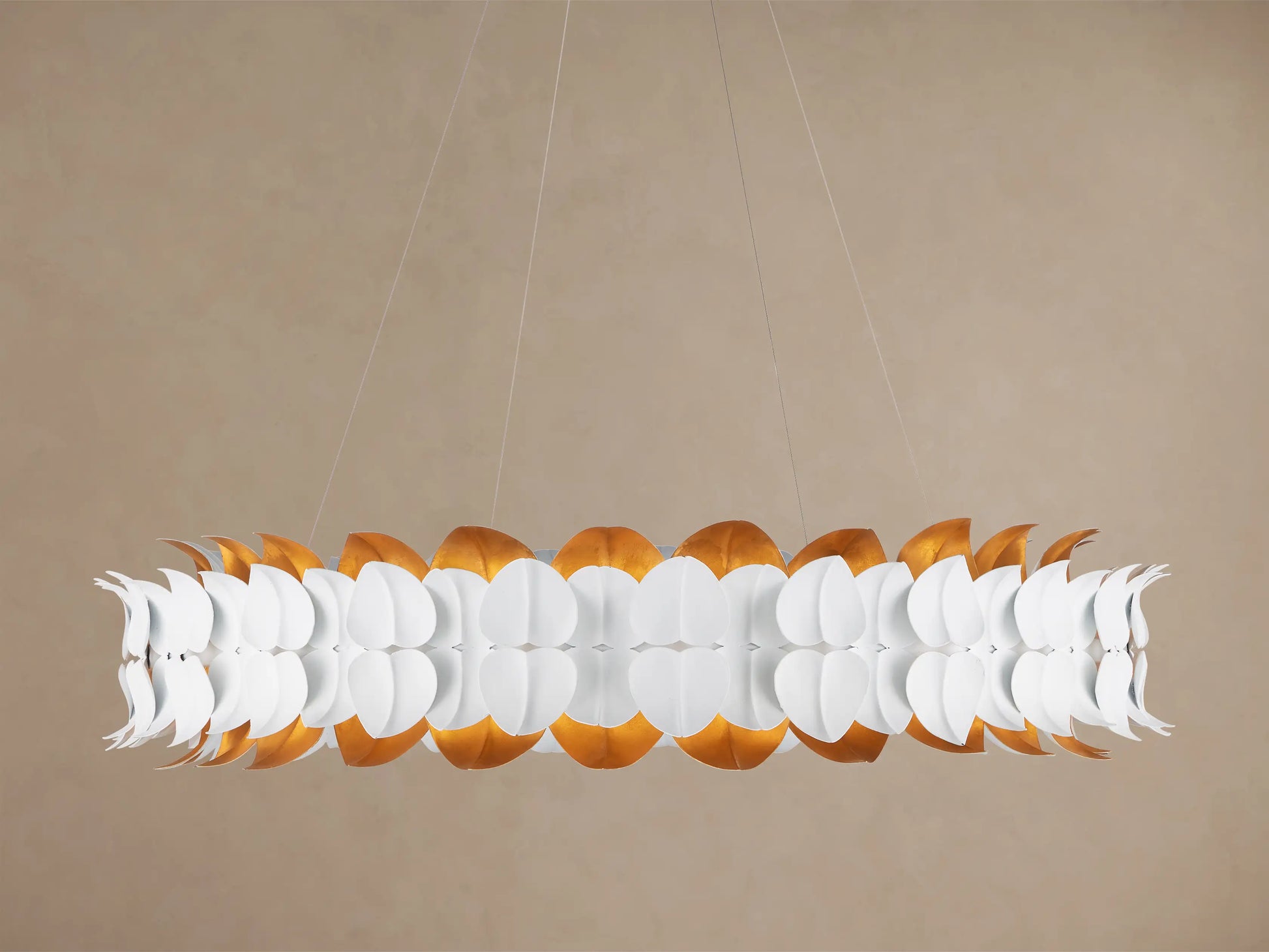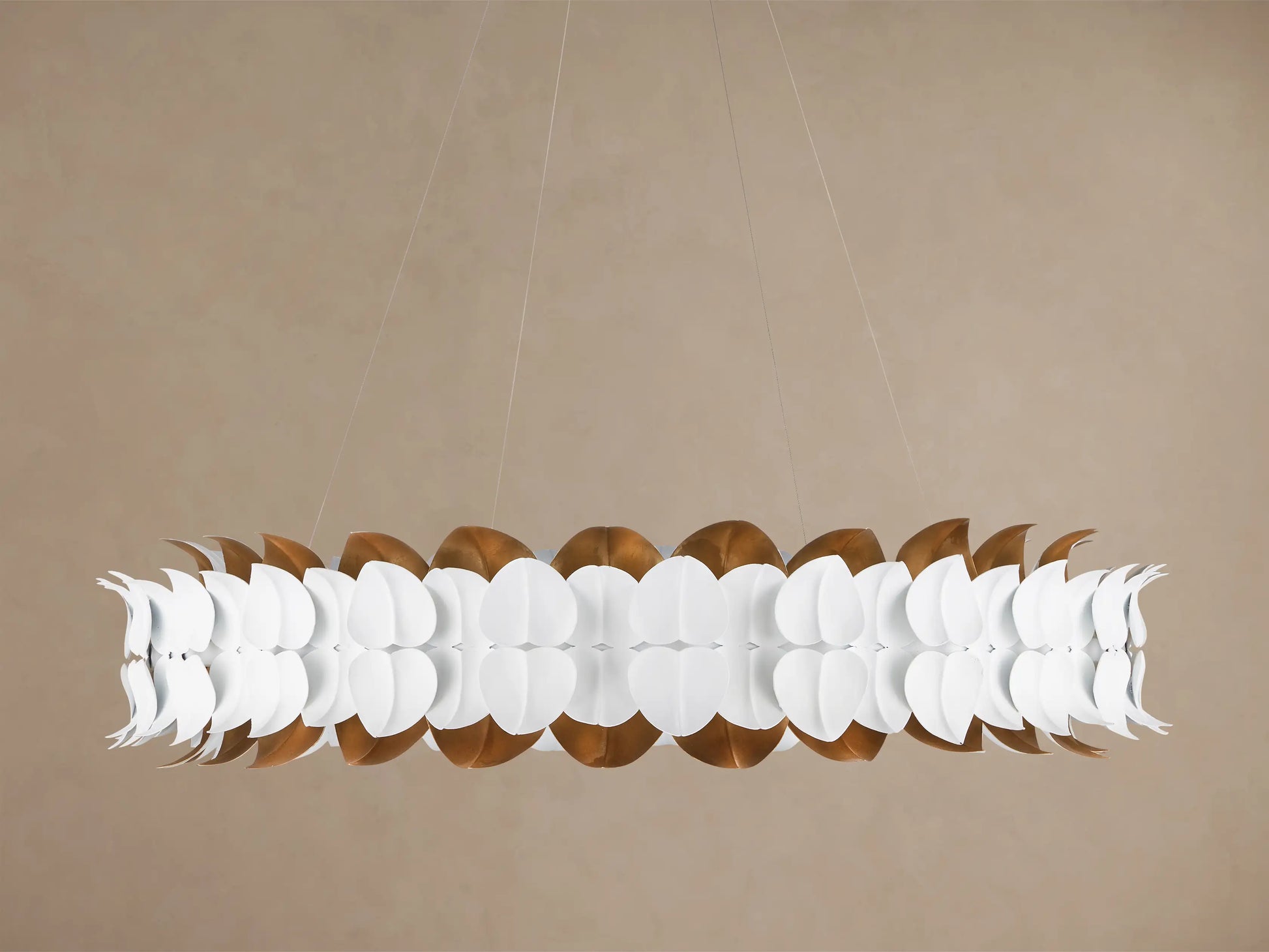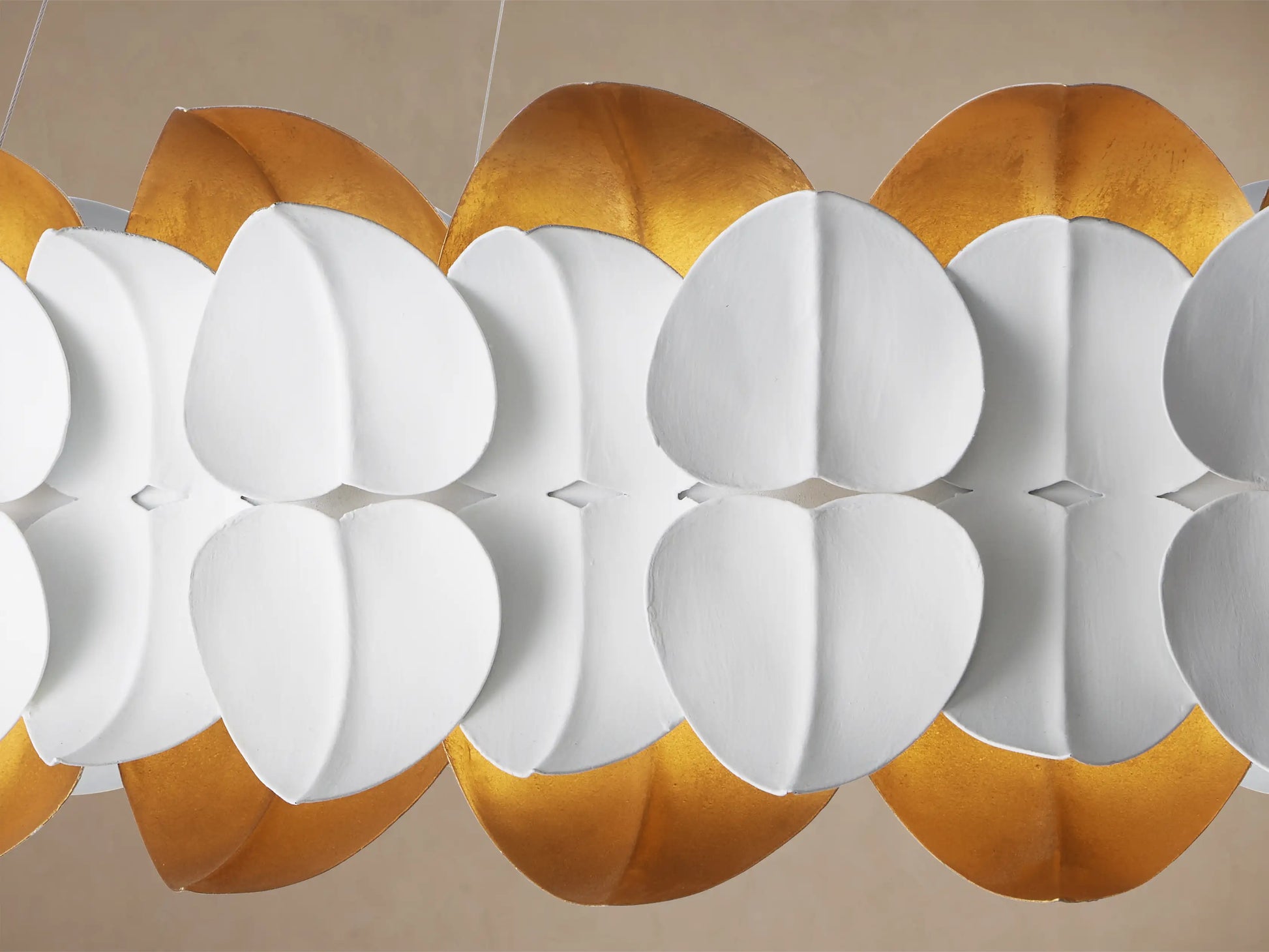Hand-sculpted leaves in glossy white and shimmering gold form the luminous crown on our Darla Chandelier. Integrated LEDs create a warm inner glow, highlighting every intricate detail.