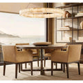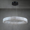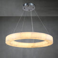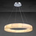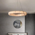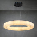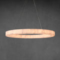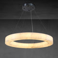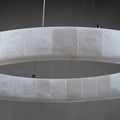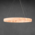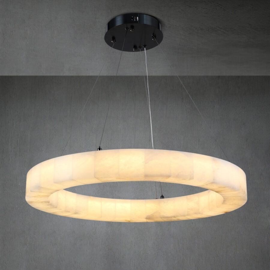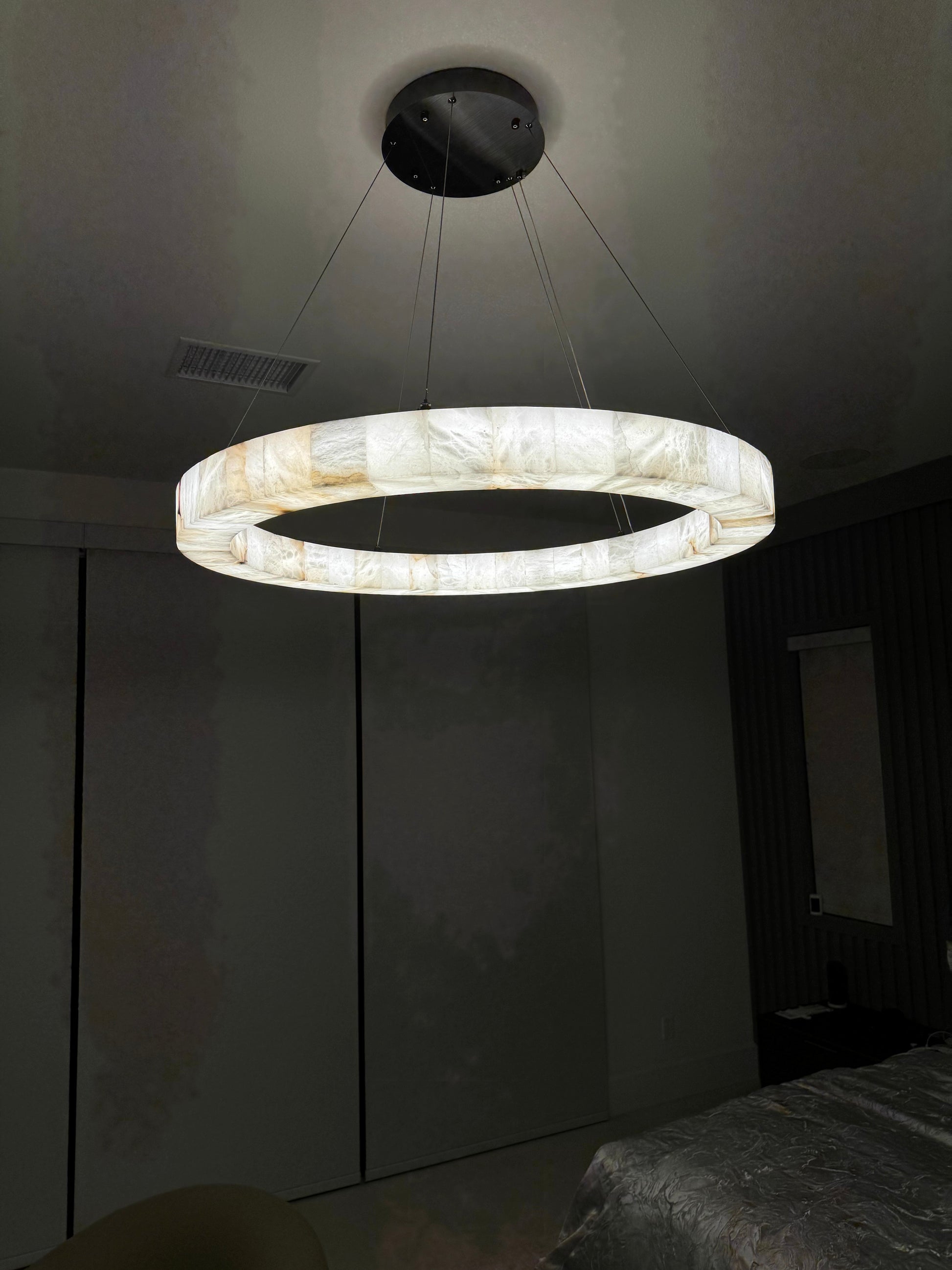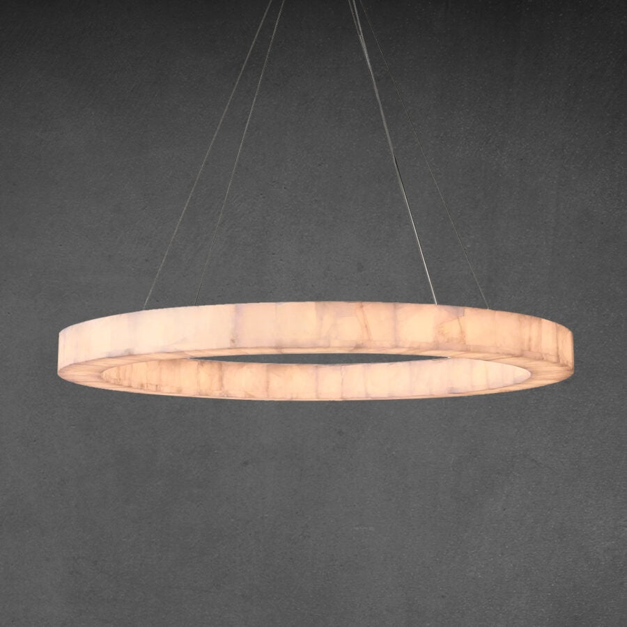 A collection of chandelier with minimal shapes and striking effects, highlighting the beauty of calcite, a translucent stone that radiates a warm, natural glow. Halos of polished stone are suspended from slender steel cables, artfully stitched together to create a smooth, continuous surface, while subtle lighting inside accentuates the organic colors and textures. Each luminaire is a unique statement.