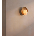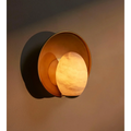 A sculptural alabaster wall sconce featuring a solid brass backplate and a hand-carved alabaster stone diffuser. The natural veining in each alabaster piece creates a uniquely soft, ambient glow, transforming ordinary light into an artistic display.