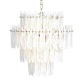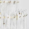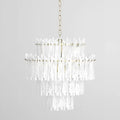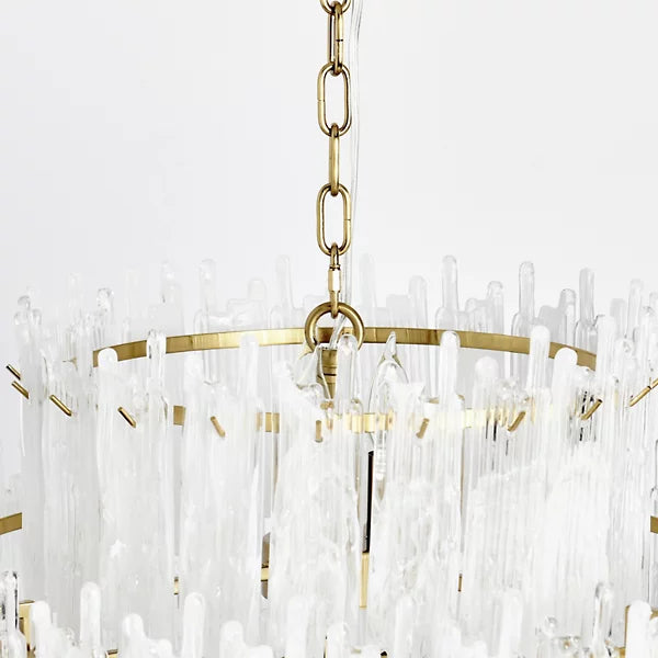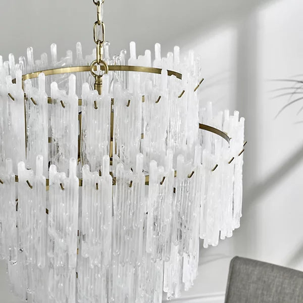 The Everly Chandelier by Classic Home transforms conventional illumination into an individual artistic expression of light and texture. Wax-drop glass cascades through four dramatic tiers, creating a mesmerizing dance of sparkling radiance. Each wax-drop glass plate is a unique art piece, suspended from a slender hook around the outer rim of each ring. The tall structure matches intricate Art Deco design with contemporary clarity, casting a mix of glittering brilliance and strong downlight that gloriously accents its surroundings.