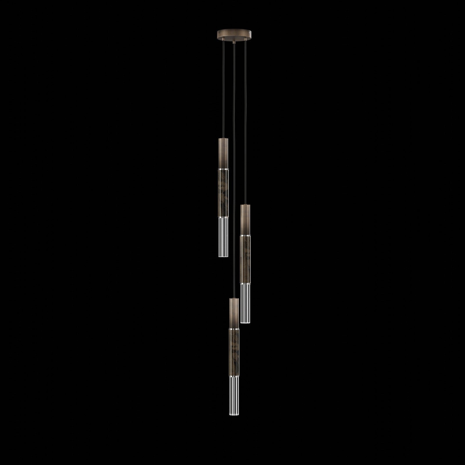 Suspended by adjustable cords, this LED fixture features straight tubular lines and the inclusion of metals carefully handcrafted to transition from parchment to magnificent glass, culminating in a stunning beam of light. Available in a wide range of exquisite finishes, including our five standard finishes and our newest Soft Ombre Bronze & Soft Ombre Silver, with the choice of two inline parchment colors, Charcoal and Smoke, and three special order options: Mink, Burnt Orange & Navy/Gold. Also available with no parchment.