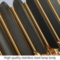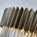 This incredible piece commands the attention of everyone who enters the room. A truly stylish modern crystal chandelier that fits perfectly in any space in your home. The color of the frame is very similar to gunmetal gray with gold inlay trim detail between the strips.