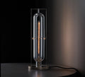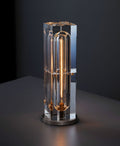 The Glacon Rectangular Table Lamp is machined from solid brass. All parts are hand polished and patina’d. Each lead crystal half is hand carved and polished, held in place by 4 individual brass pins.