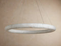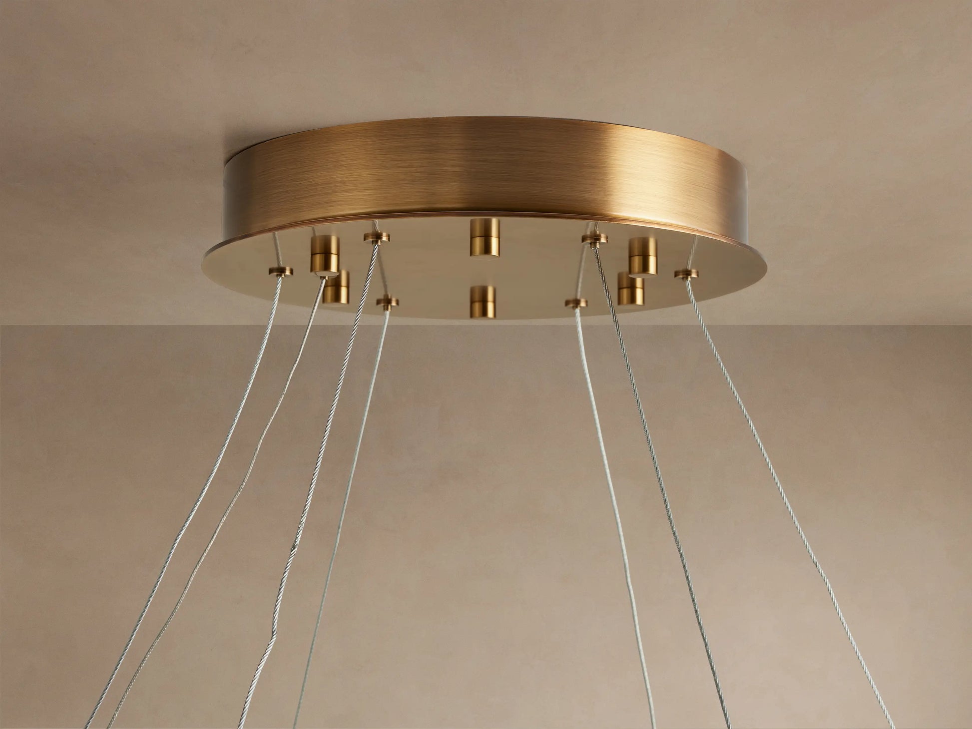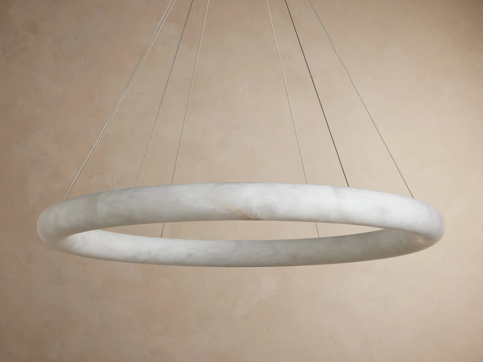 - Crafted from Spanish alabaster stone, steel cables, and brass accents on the canopy.