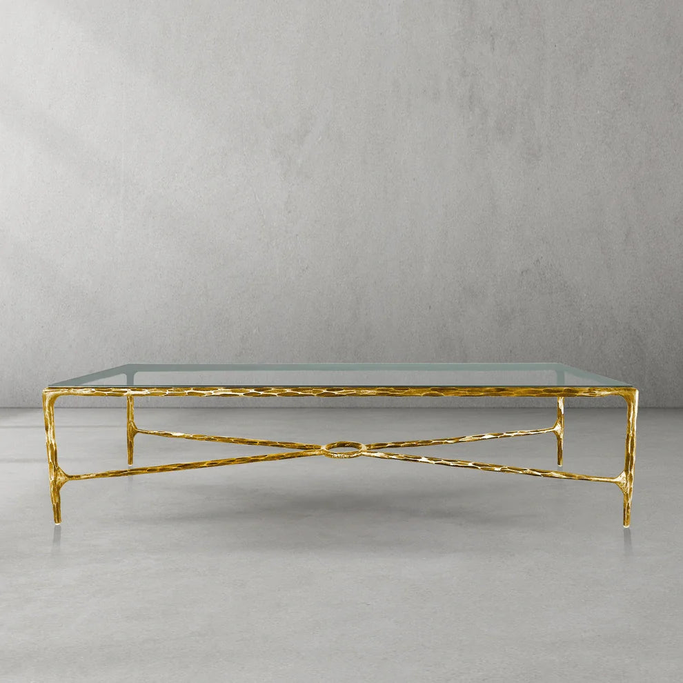 Our collection by the rustic sensibility of a hand-forged metal base with a clear glass top. Employing an ancient fabrication process, artisans hand hammer the metal bars to reveal an alive, imperfect and organic texture, a counterpoint to the frame's slender, tapered silhouette.