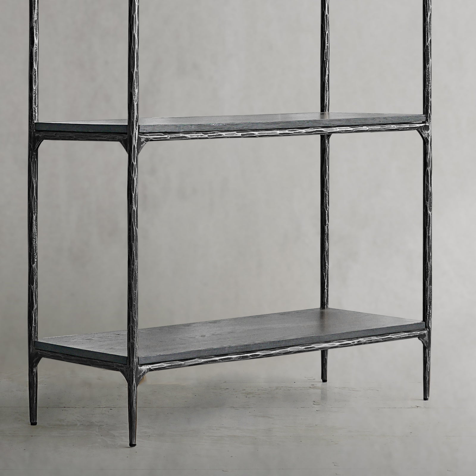 Our collection combines a hand-forged metal base with the rustic feel of marble shelving. Using an ancient crafting technique, artisans hand-hammer metal strips for a vibrant, imperfectly organic texture that complements the frame's slim, tapered silhouette.
