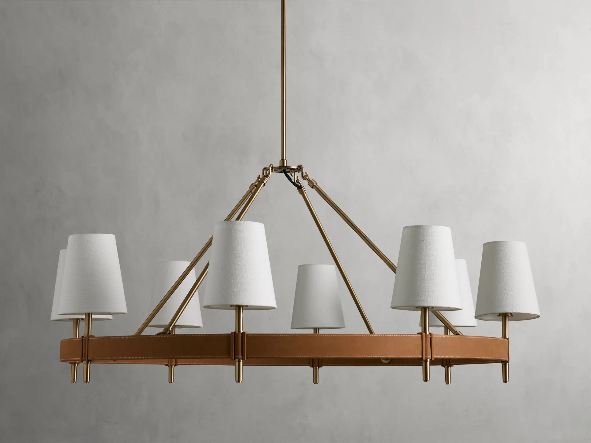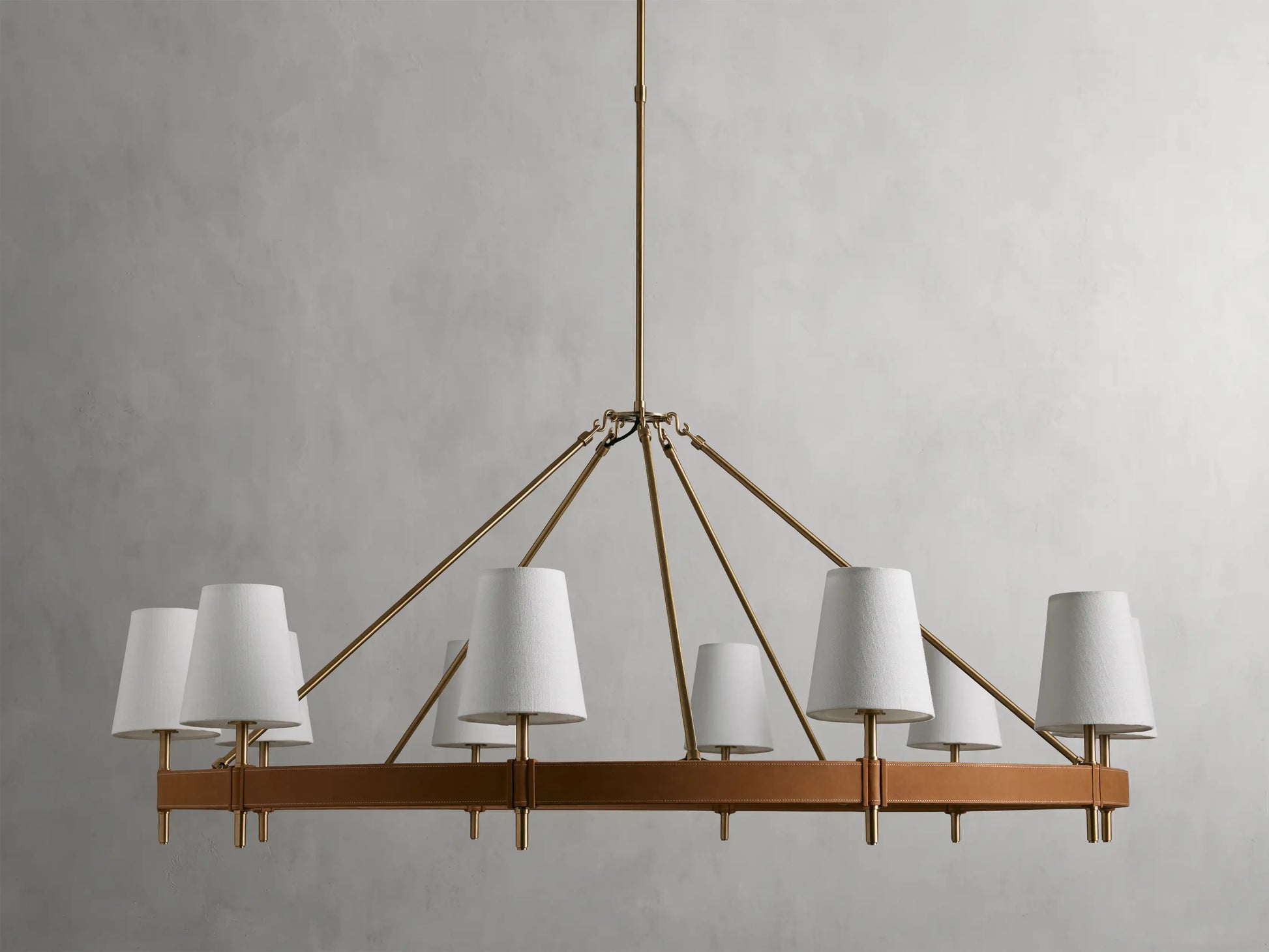 Iconic midcentury modern design and a juxtaposition of mixed materials inspire our Hastings Lighting Collection. Bases crafted from brass with an antiqued finish are complemented by tan leather stitched details and white linen shades to bring thoughtful elegance to any space.