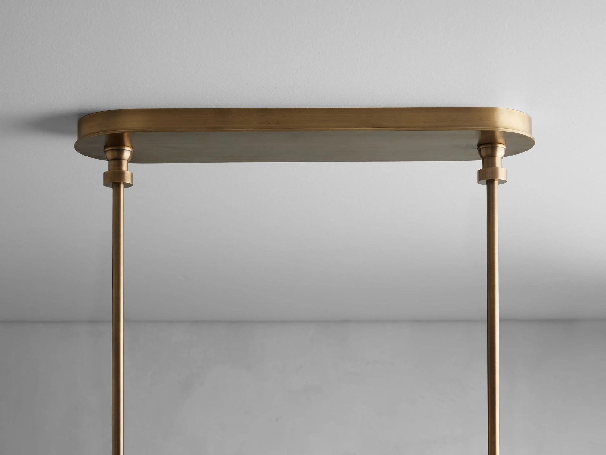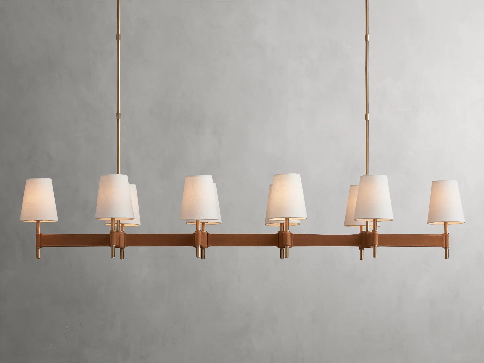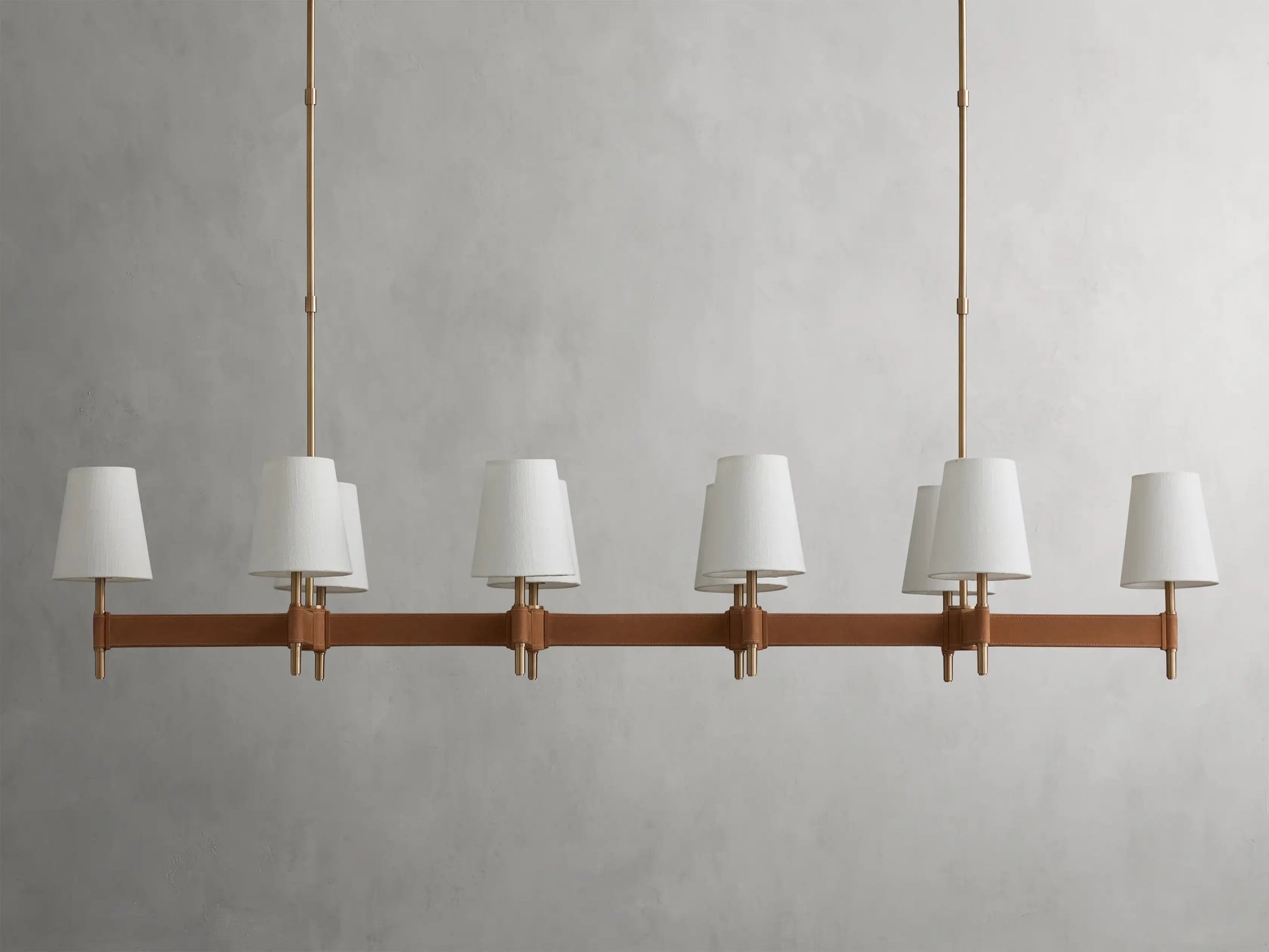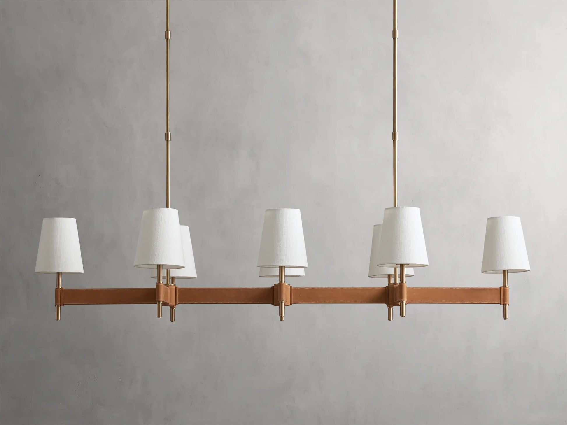 Iconic midcentury modern design and a juxtaposition of mixed materials inspire our Hastings Lighting Collection. Bases crafted from brass with an antiqued finish are complemented by tan leather stitched details and white linen shades to bring thoughtful elegance to any space.