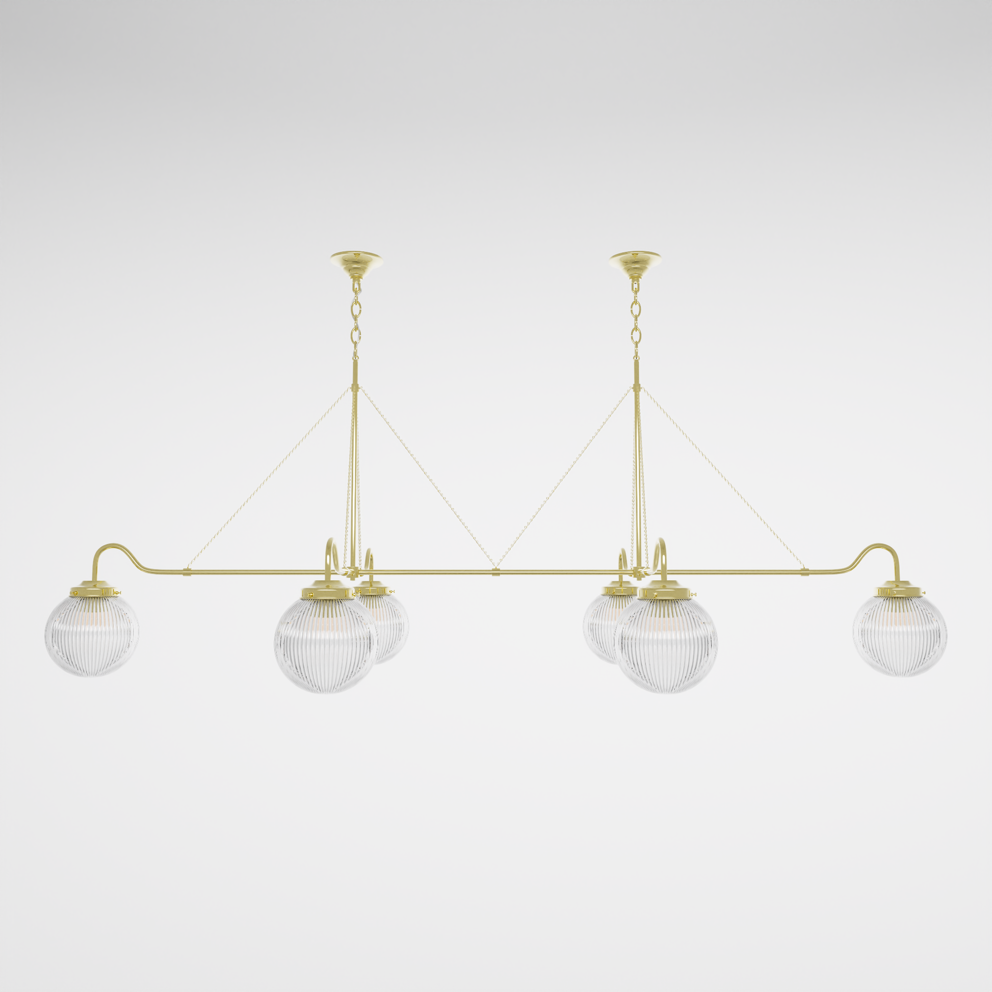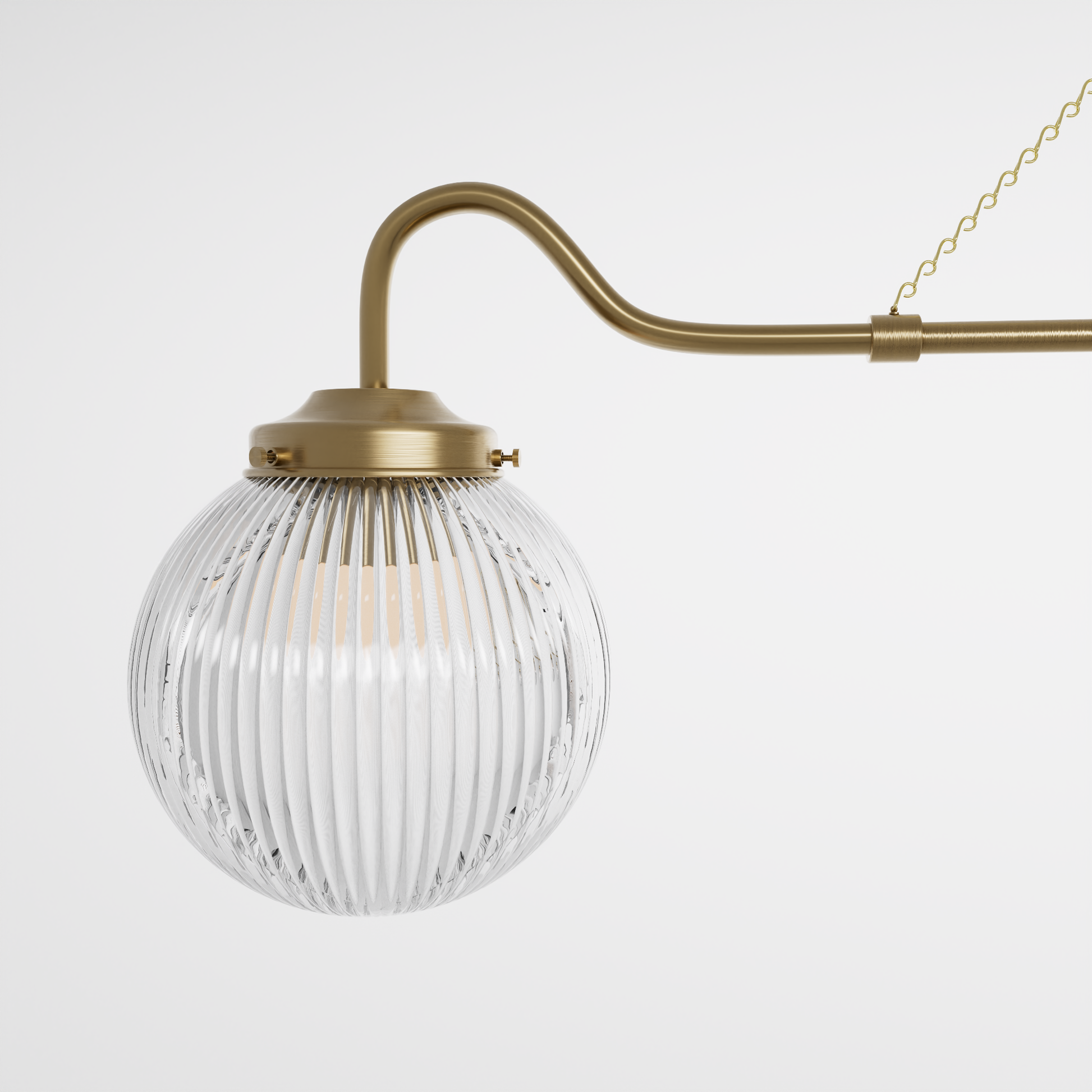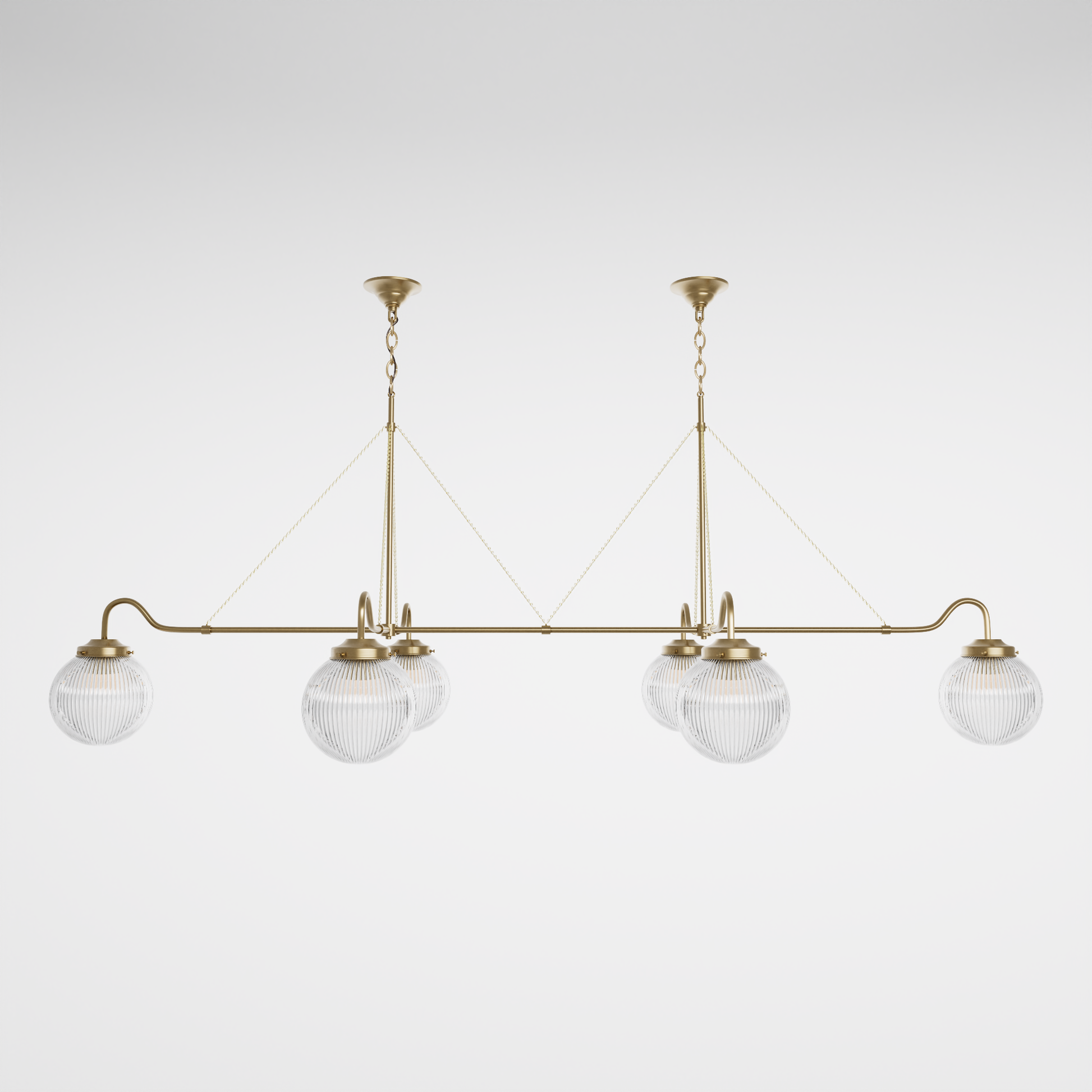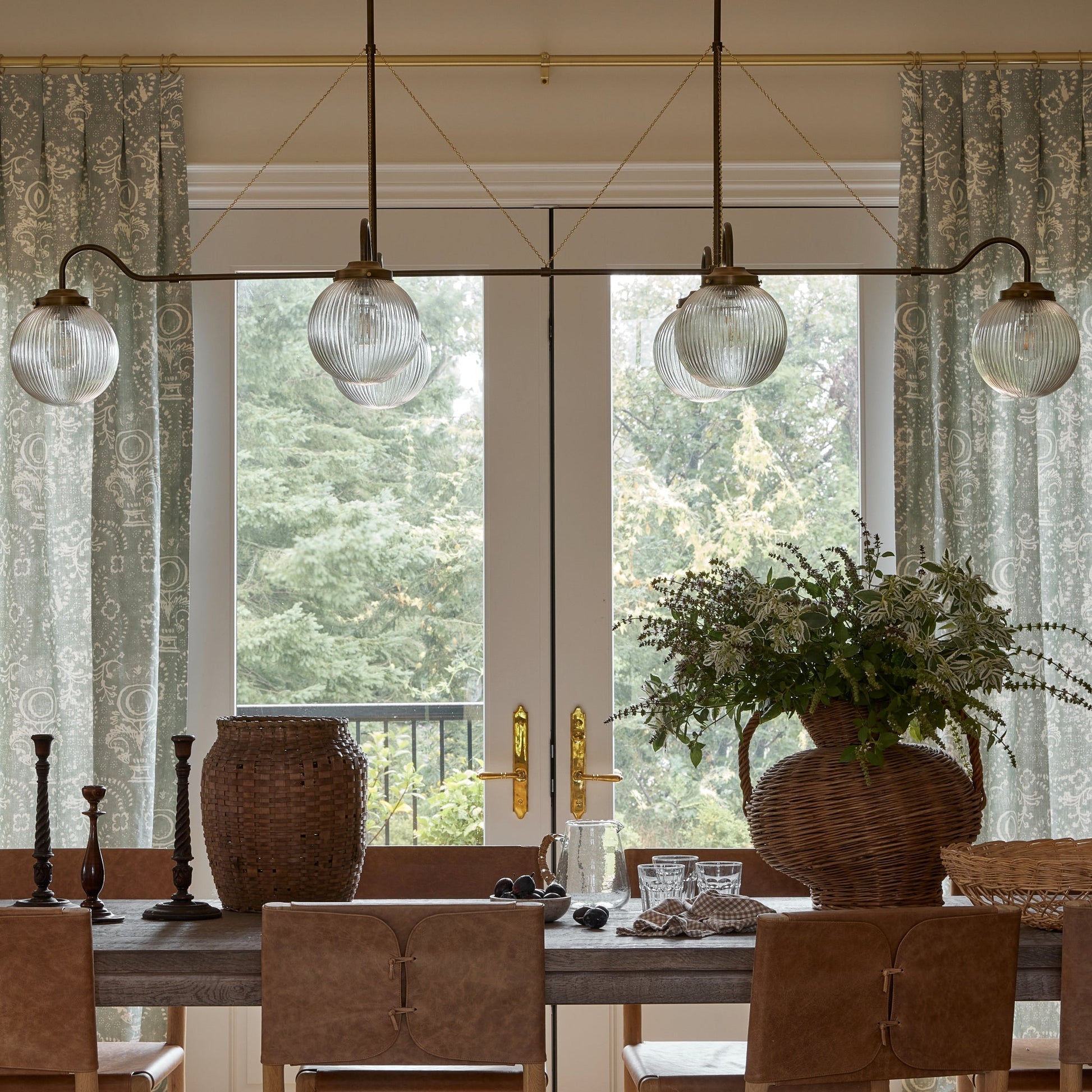 Inspired by the country side, the Hayden collection is built with solid brass that's hand finished. Each Hayden fixture arm features a thick ribbed glass globe secured by a house bent shepherd crook. We love this fixture in high ceiling rooms, above wide kitchen islands, over larger dining tables, and in game rooms.