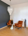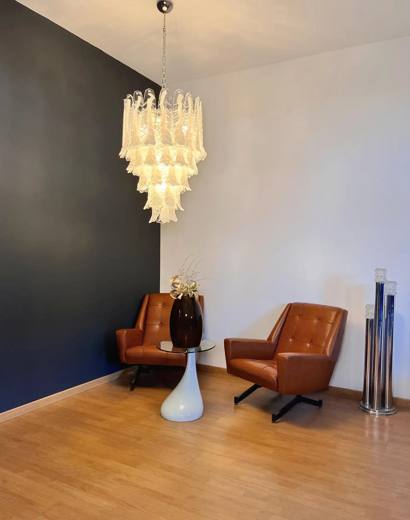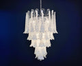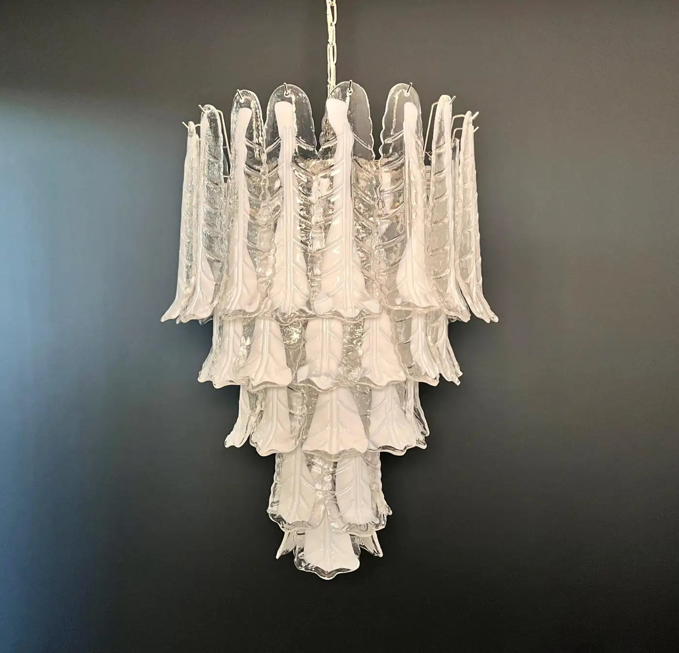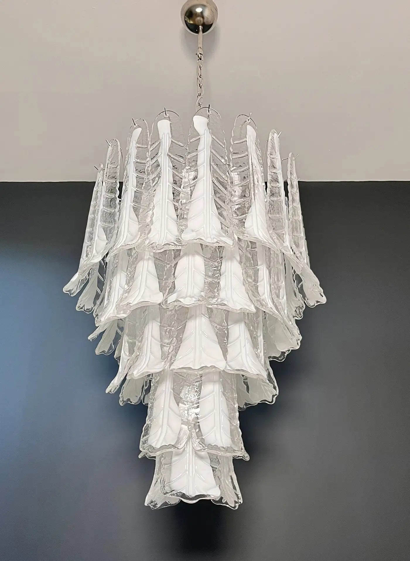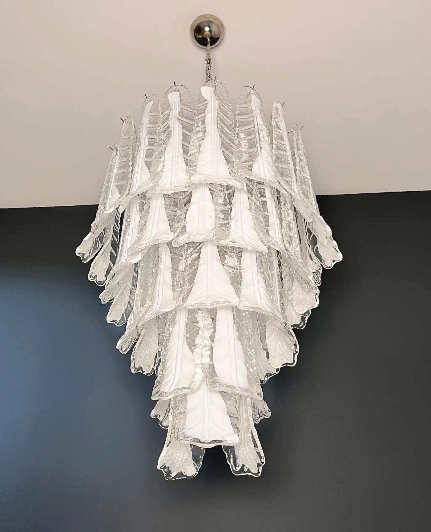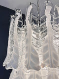 Huge Italian vintage Murano chandelier made by 52 glass petals (transparent and white “lattimo”) in a chrome frame. The glasses are shaped like a necktie, a unique style, beautiful.
