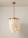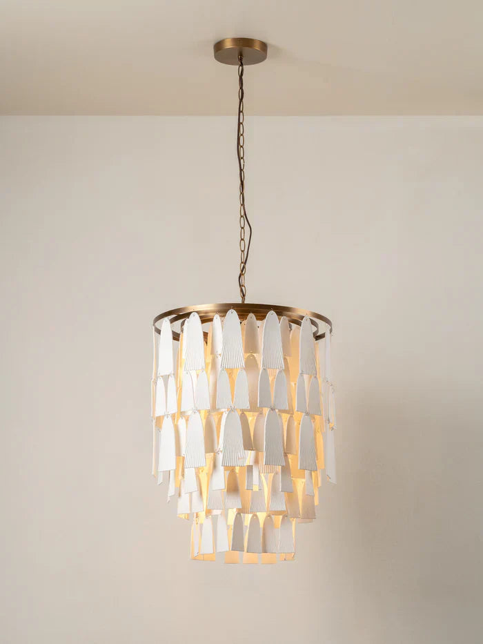A stunningly organic style chandelier. 4 tiers of textured porcelain seemingly float around the central light creating layer upon later of warm natural tones. 243 varying sizes of fluted porcelain drops create a feathered effect which look simply beautiful by night and as light as a wind chime by day.