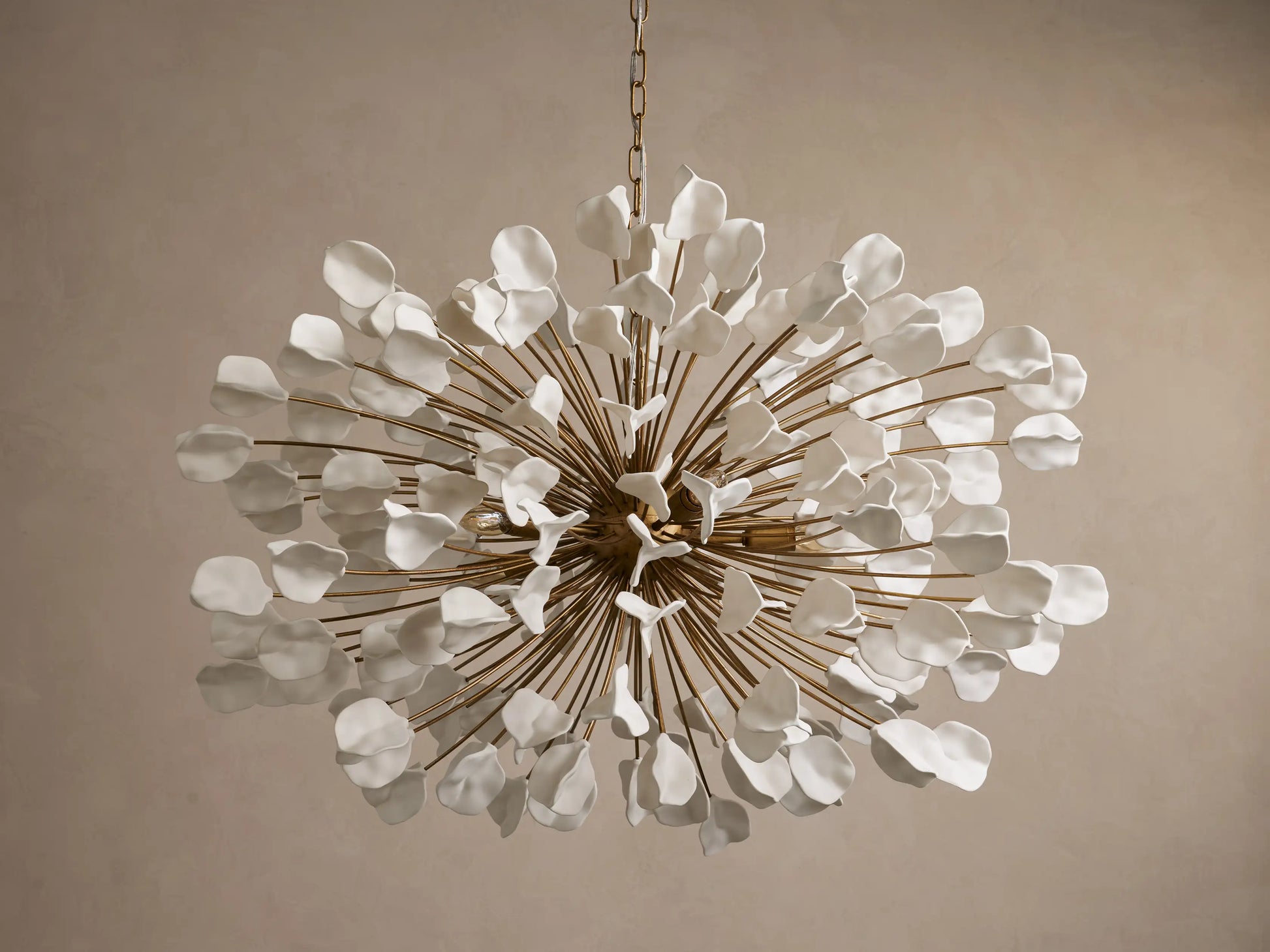 Inspired by the ethereal elegance of the lunaria plant, our Lanrie Lighting Collection captures the delicate beauty of nature in bloom. Handcrafted by ceramic artisans in Italy, each light artfully displays a cluster of ceramic petals that cascade from an iron frame creating a sense of organic movement. Offering a gentle, diffused glow, Lanrie is a luminous statement piece that feels both grounded and otherworldly.