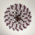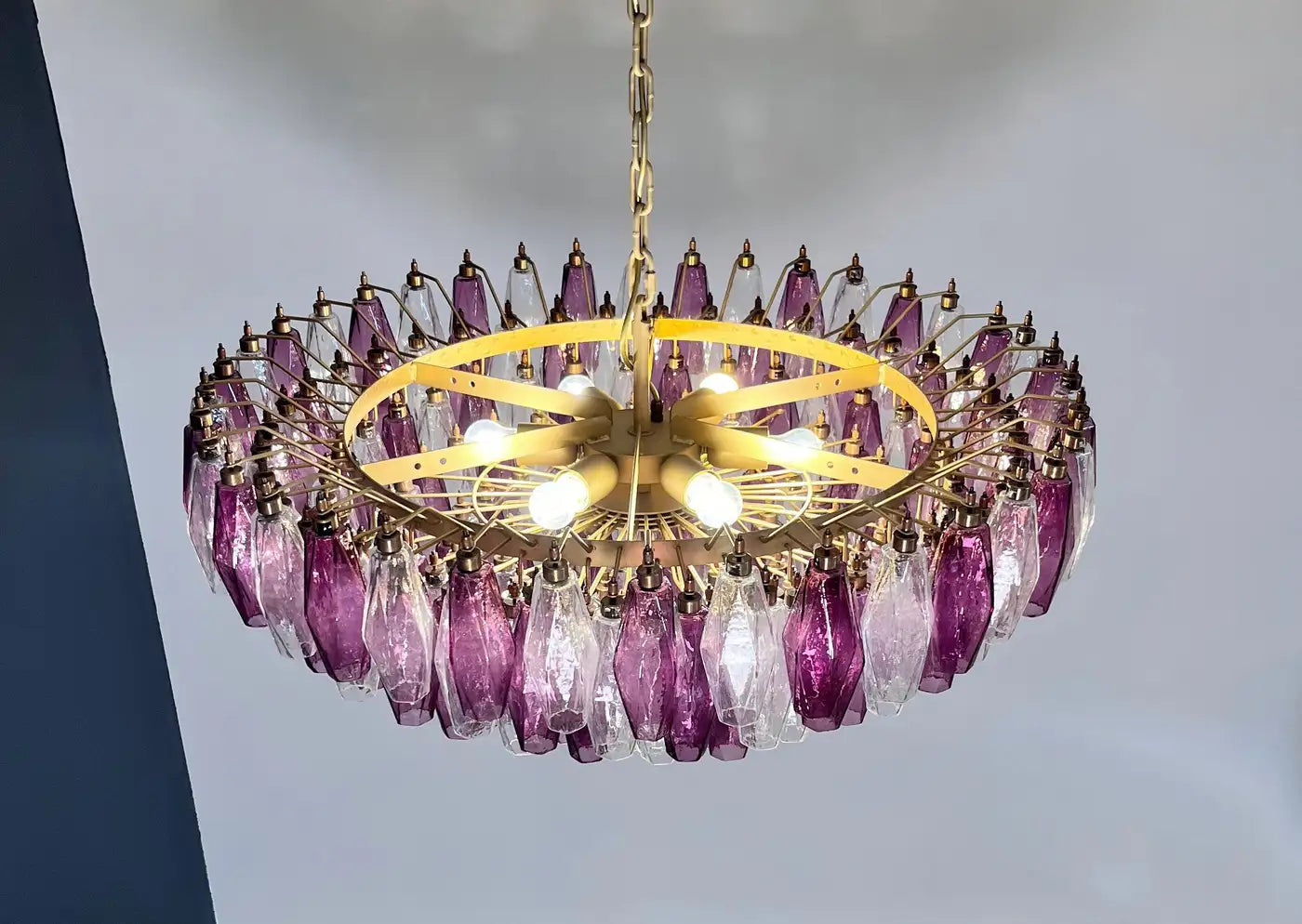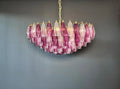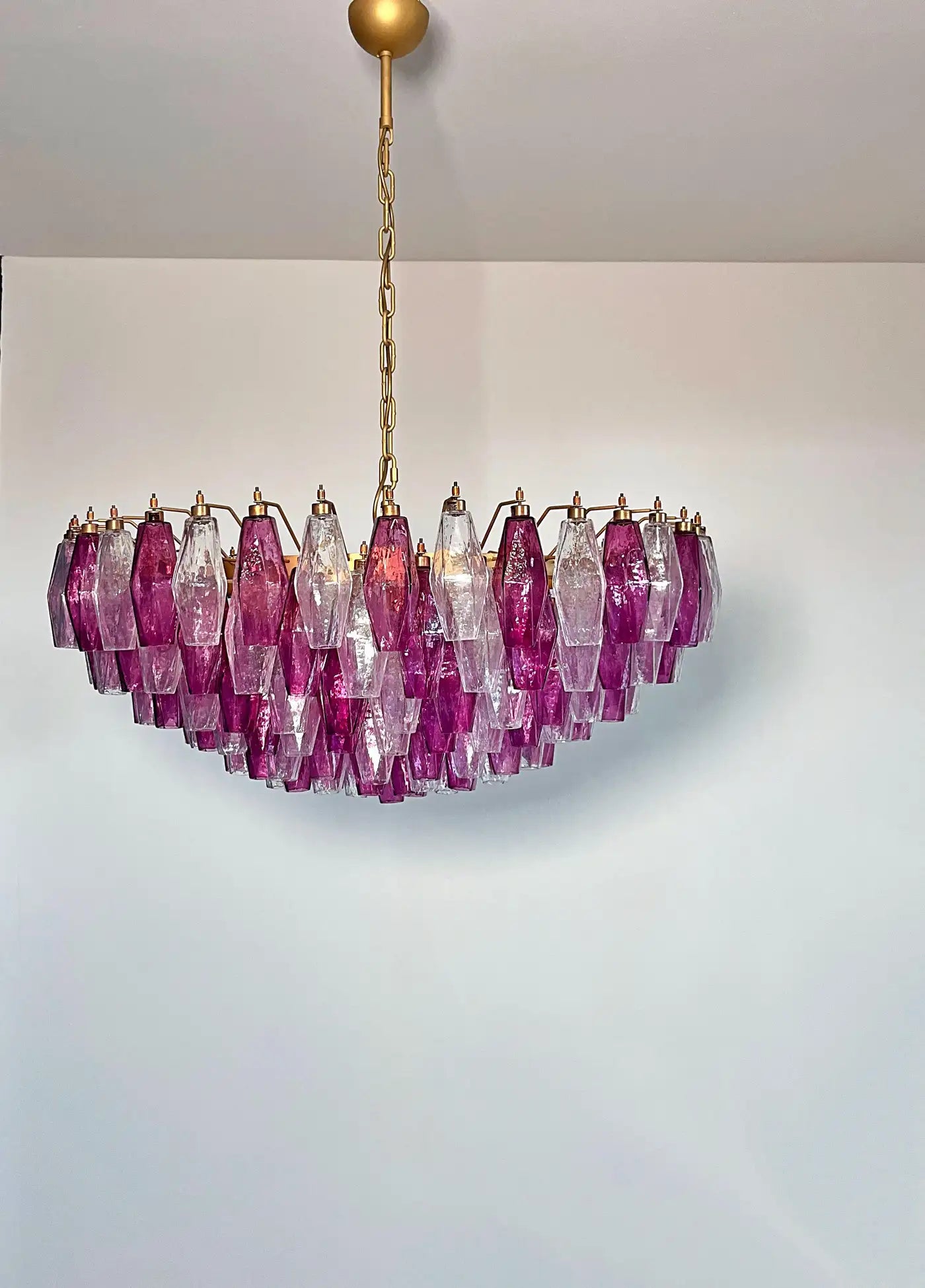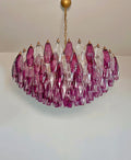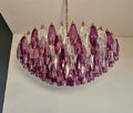 Huge Colorful Eclectic Murano Chandelier in the style of Carlo Scarpa with beautiful hand blown poliedri prisms in a bold fuchsia color as well as clear glass. Lamp structure painted in a golden bronze tone. You can choose to have the lamp structure in chrome if you would prefer. The chandelier is composed of 181 transparent glass prisms in the size of 5.9" x 2.8" / 15x7 cm. The total height of the murano chandelier can be adjusted to 25.6" - 104" / 65-265 cm as the height of the glass part of the chandelier is only 17.7" / 45 cm.